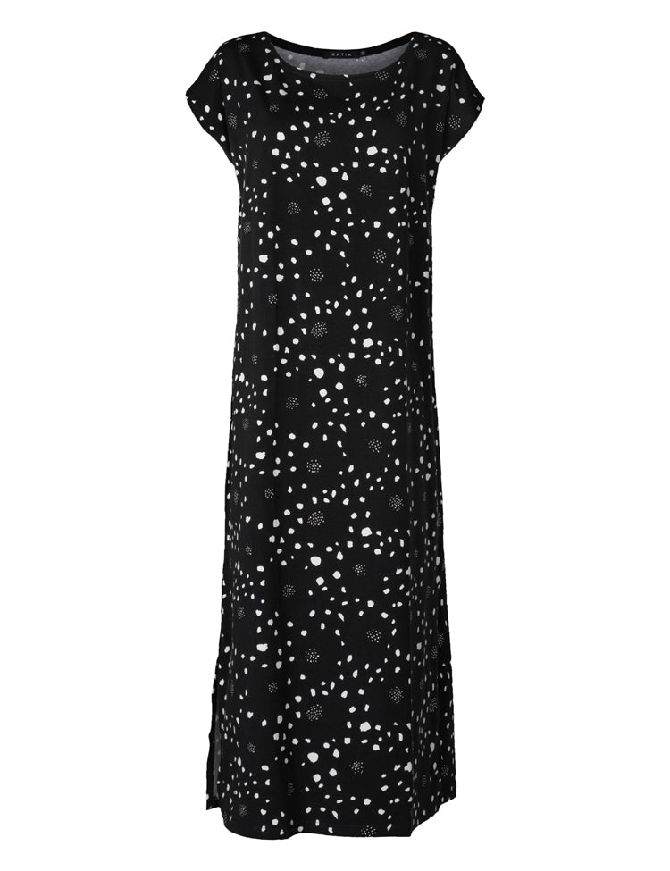 Women's straight-line jersey dress with cap sleeves. The dress is made of comfortable and easy-care cotton-elastane. The length of the dress is approximately 128 cm in size M. The product is made in Portugal.