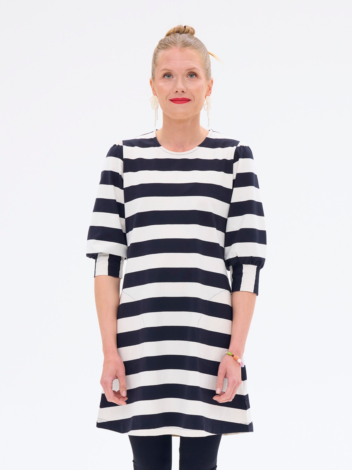 Women's 3/4-sleeved tunic in a classic black and white stripe. Stripe width 40x40 mm. The tunic is more fitted at the top and shoulder line and widens towards the hem. The tunic has slightly baggy sleeves, a round neckline and handy pockets on the sides.