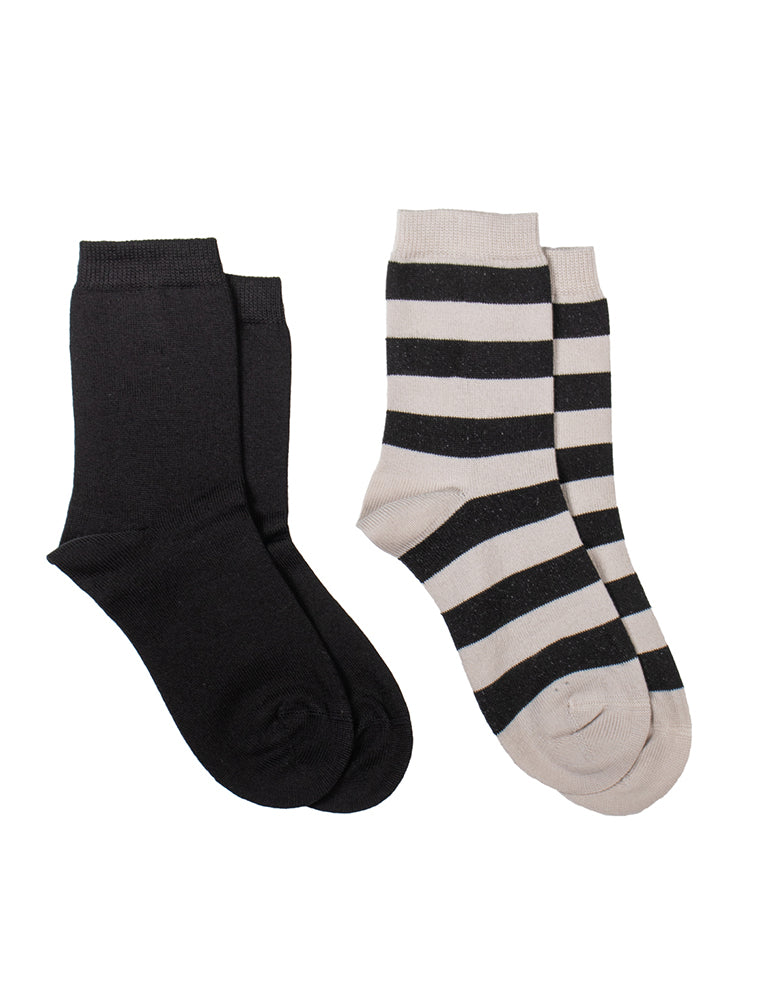 Kid's ankle socks in a pack of two pairs. The pack contains one pair of black and sand striped socks and one pair of black socks. Stripe width 2 cm. Very comfortable cotton and comfortable, stretchy elastic. Made in Portugal.