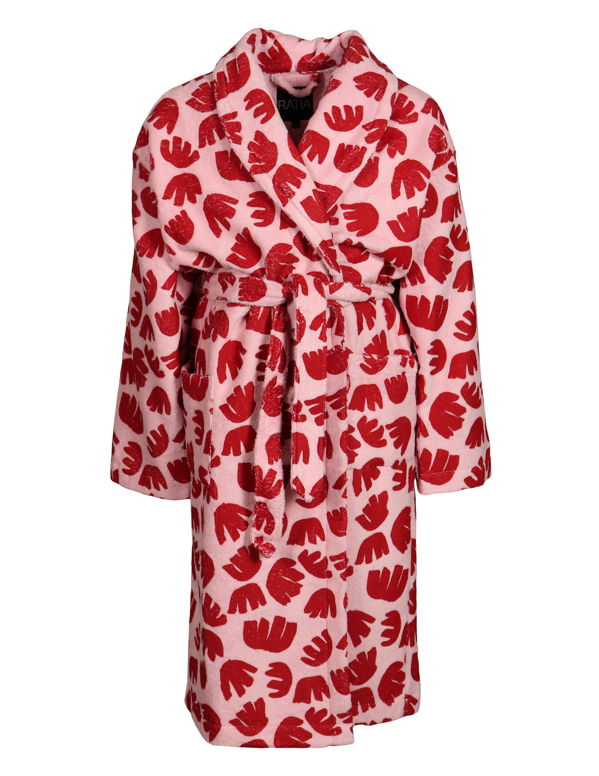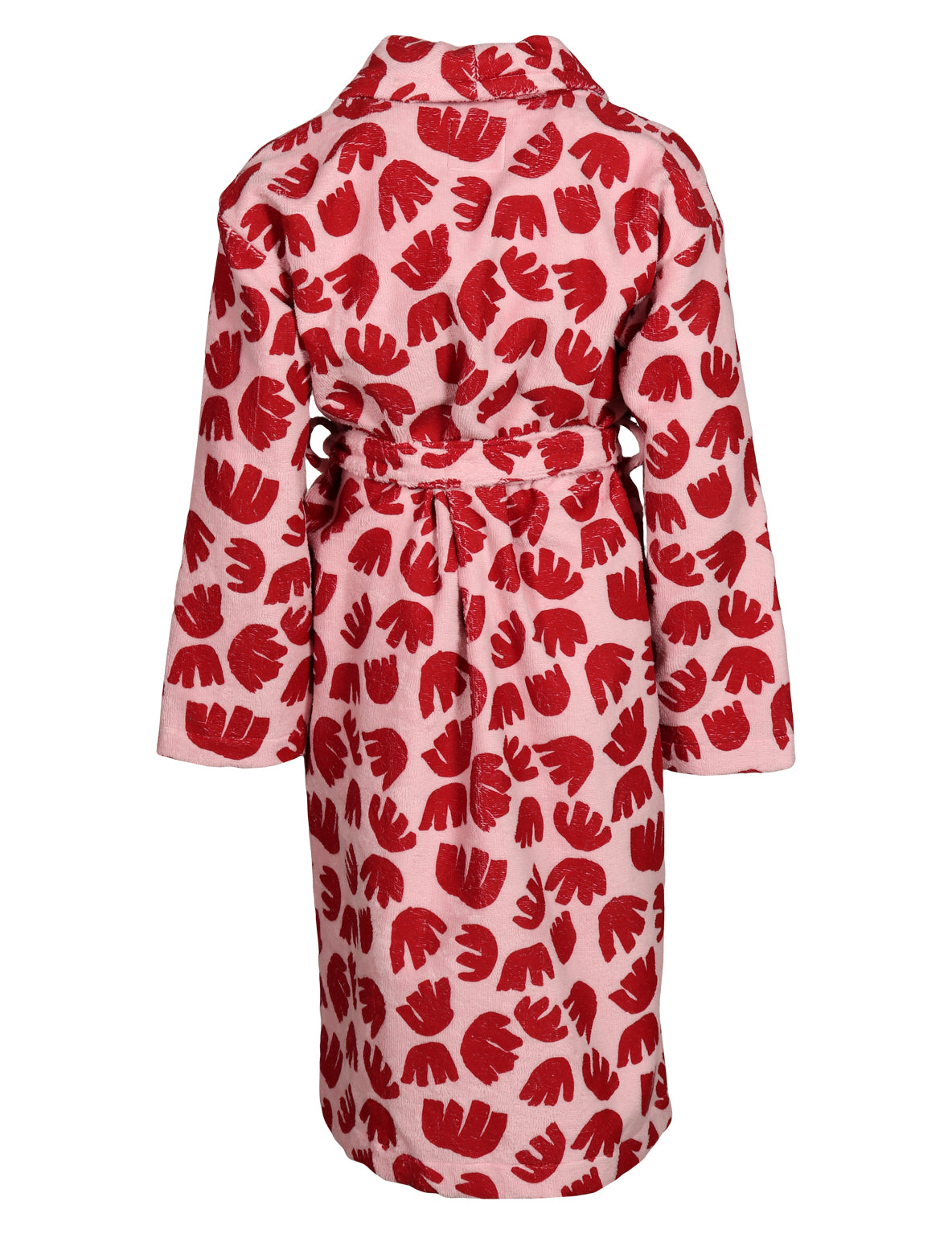 Lovely kid's jacquard velour bathrobe. The bathrobe has a shawl collar, pockets and a belt. The length of the bathrobe is approx. 70 cm in size 100 cm.