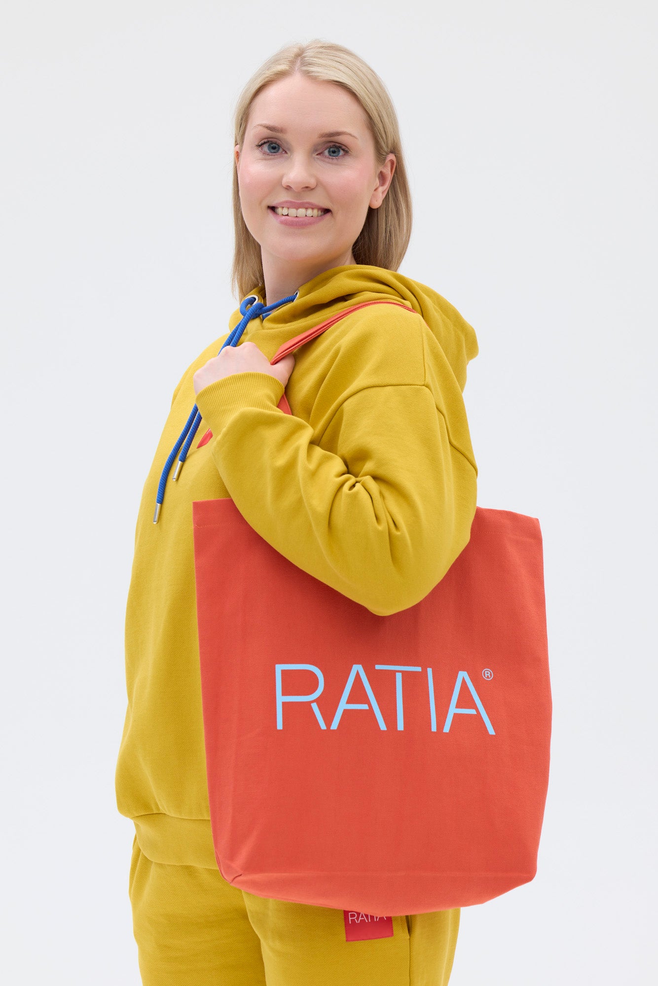 Kestävä ja monikäyttöinen kangaskassi, jossa yhdistyvät Ratia-muotoilun selkeys ja käytännöllisyys, iloisessa punaisen värissä.