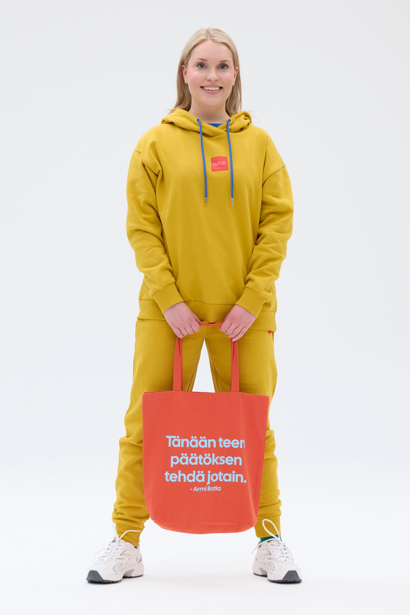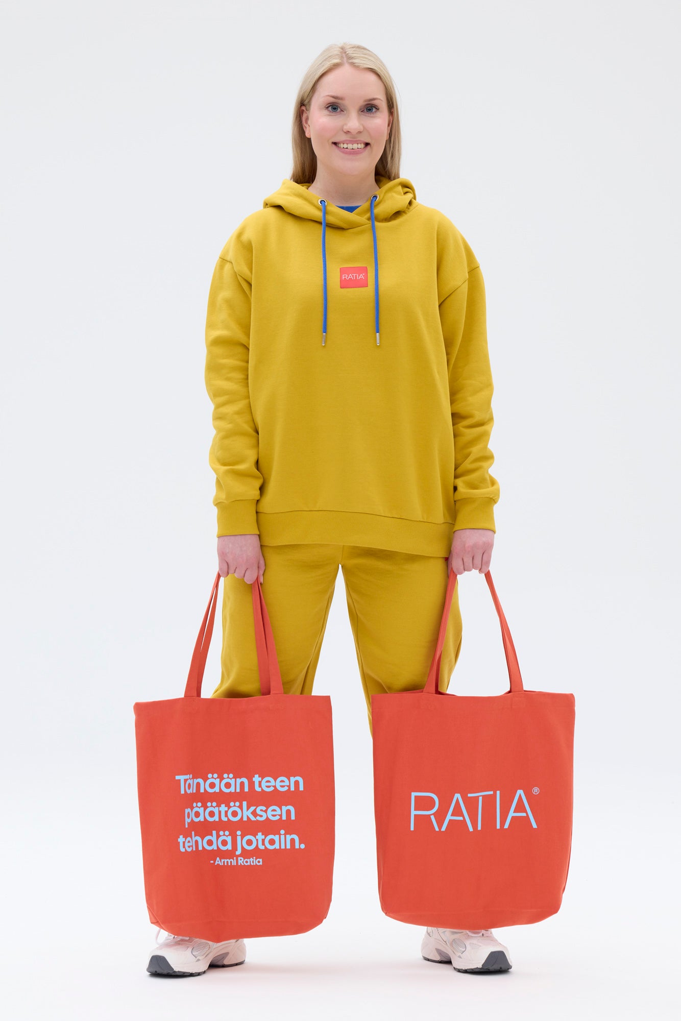 Tyylikäs ja ajaton Ratia Logo -kangaskassi on valmistettu vahvasta ja kestävästä puuvillasta. Laukun toisella puolella on klassinen Ratia-logo ja toisella puolella Armi Ratian inspiroiva mietelause – yksityiskohta, joka tuo tuotteeseen persoonallisen ilmeen.