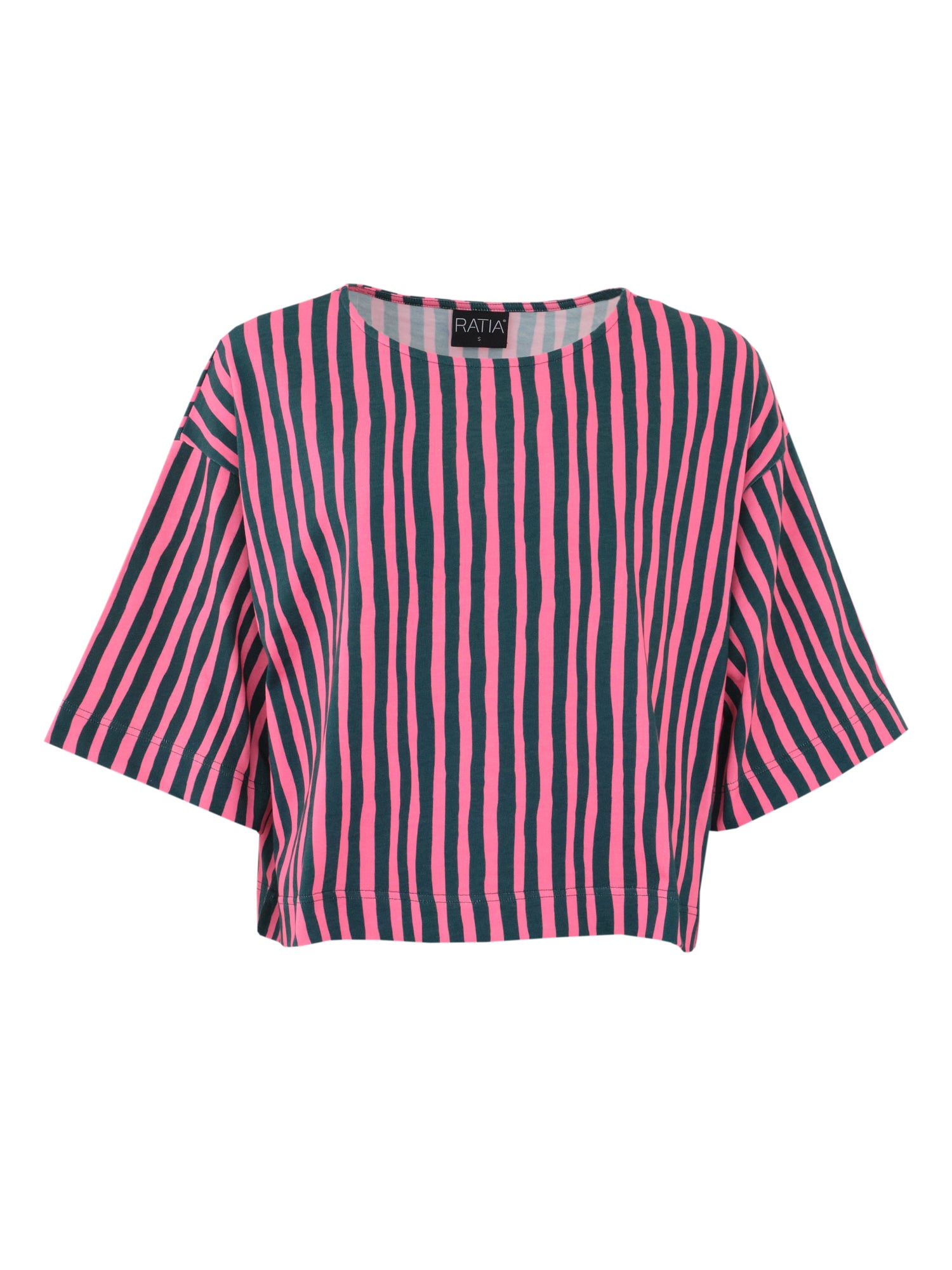 Women's vibrant striped Aavistus t-shirt. The shirt has a round neckline and 2/3 sleeves. The length of the shirt in size M is approximately 57 cm. The material is pleasant to the touch and easy-care cotton.