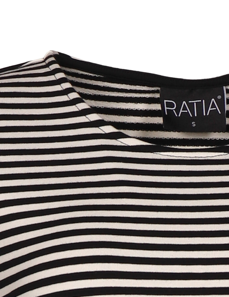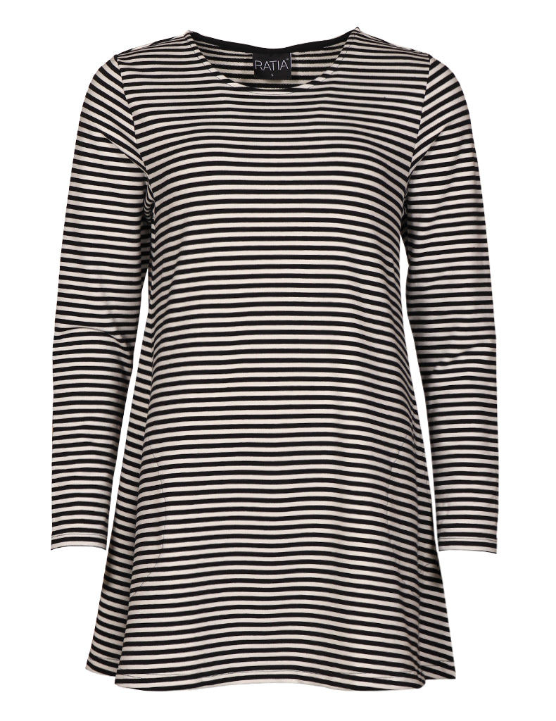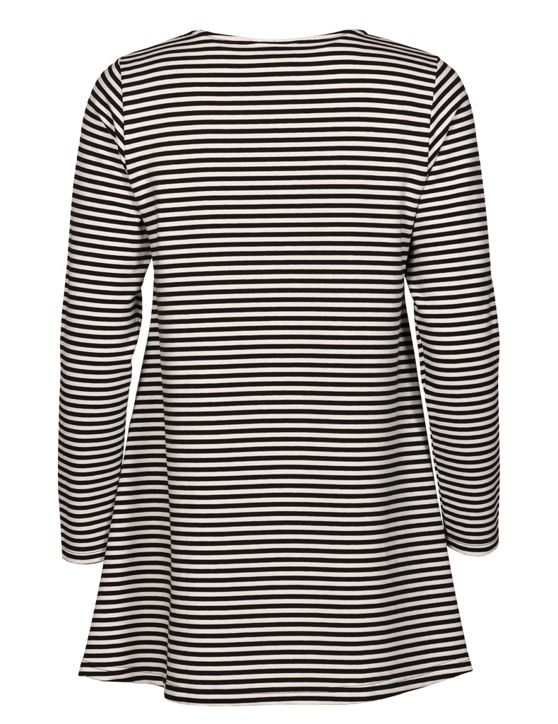 Women's striped tunic made of lightweight college fabric. The stripe width is 5 mm. The tunic has a round neckline, side pockets and long sleeves. The length of the tunic in size M is approximately 82 cm. The material is pleasant to the touch, slightly thicker, smooth surface, with a loop yarn on the wrong side and made of easy-care cotton-elastane college knit. A comfortable tunic for everyday life and work.