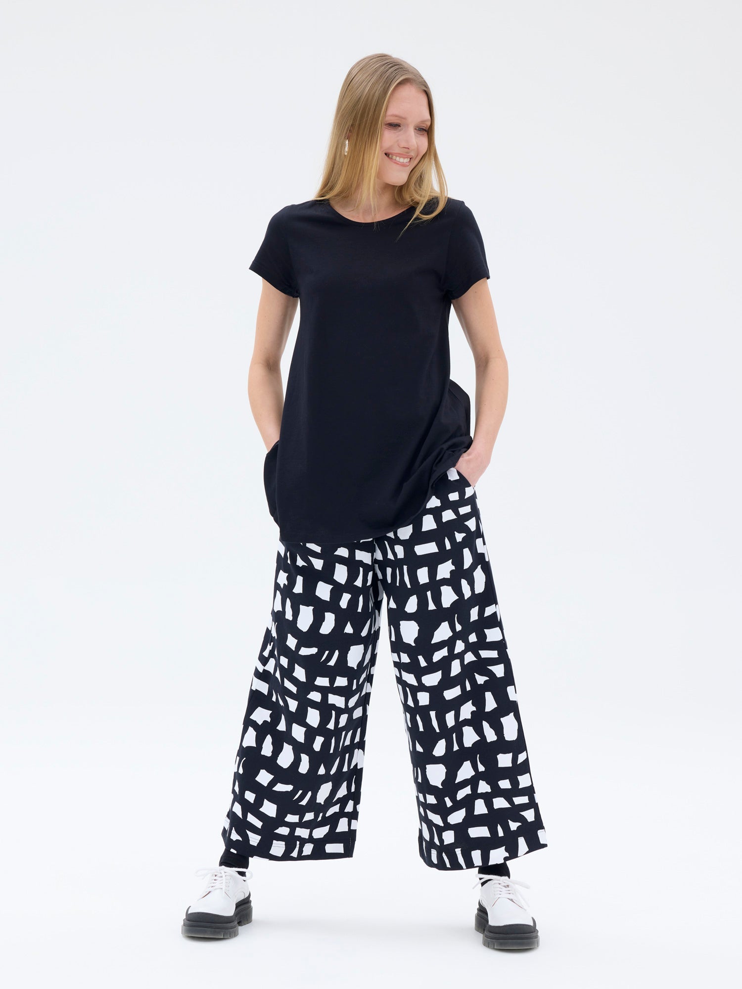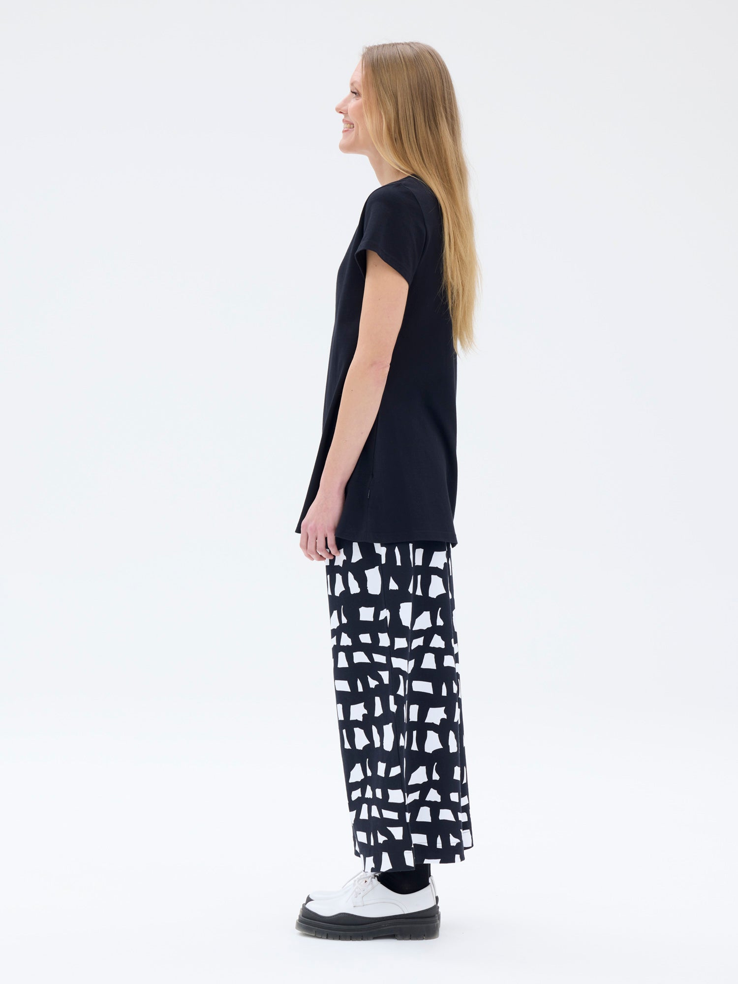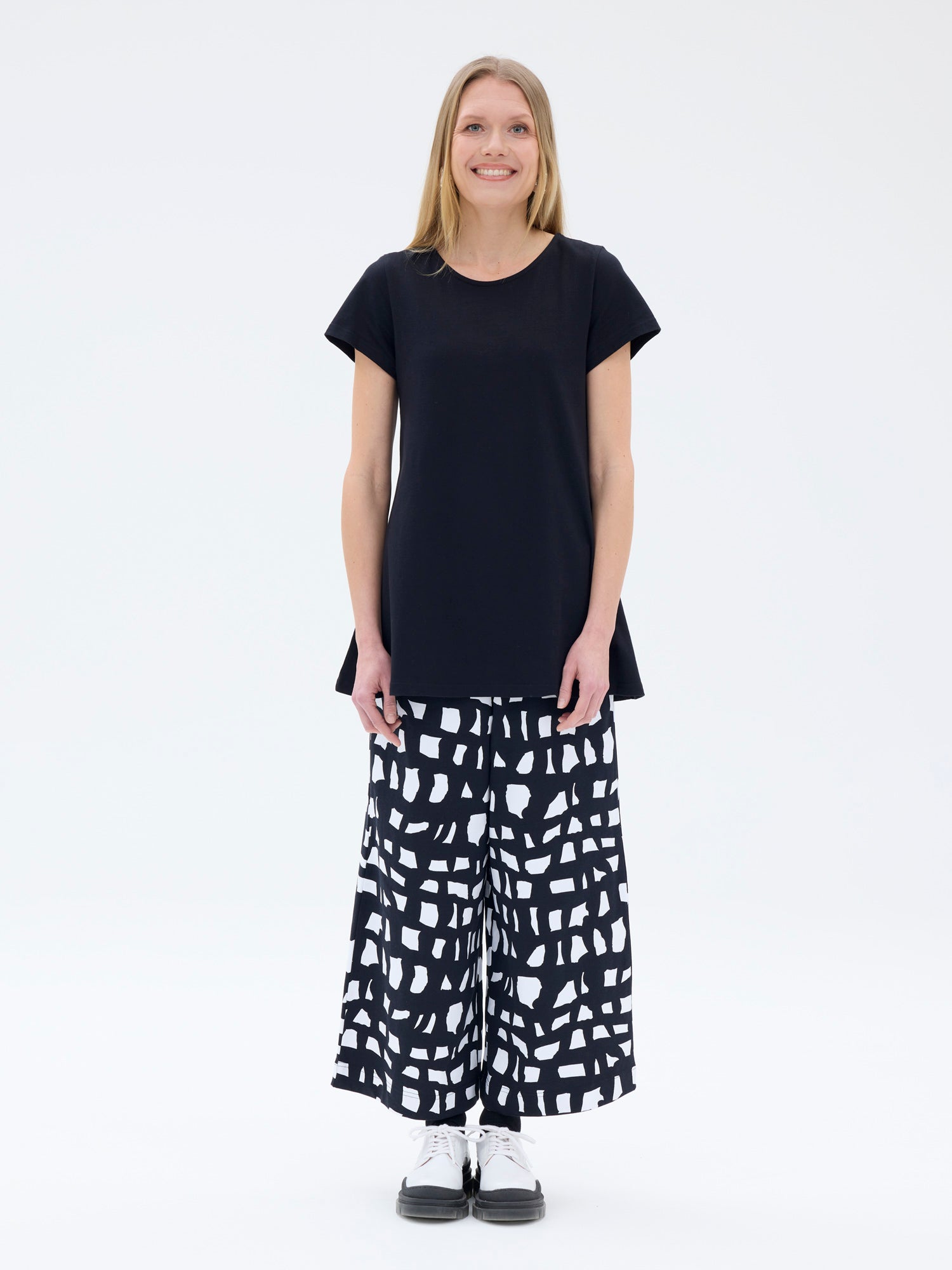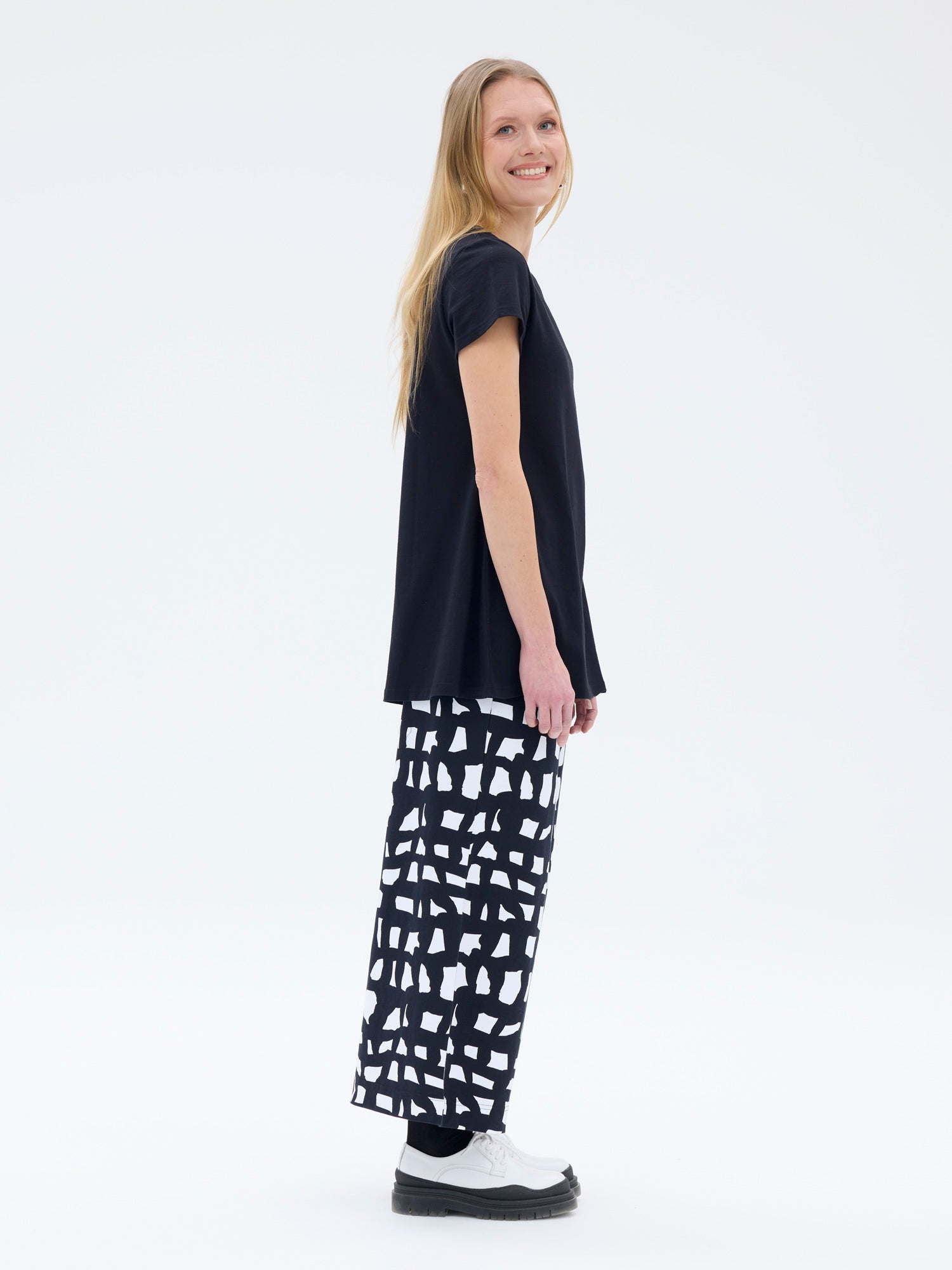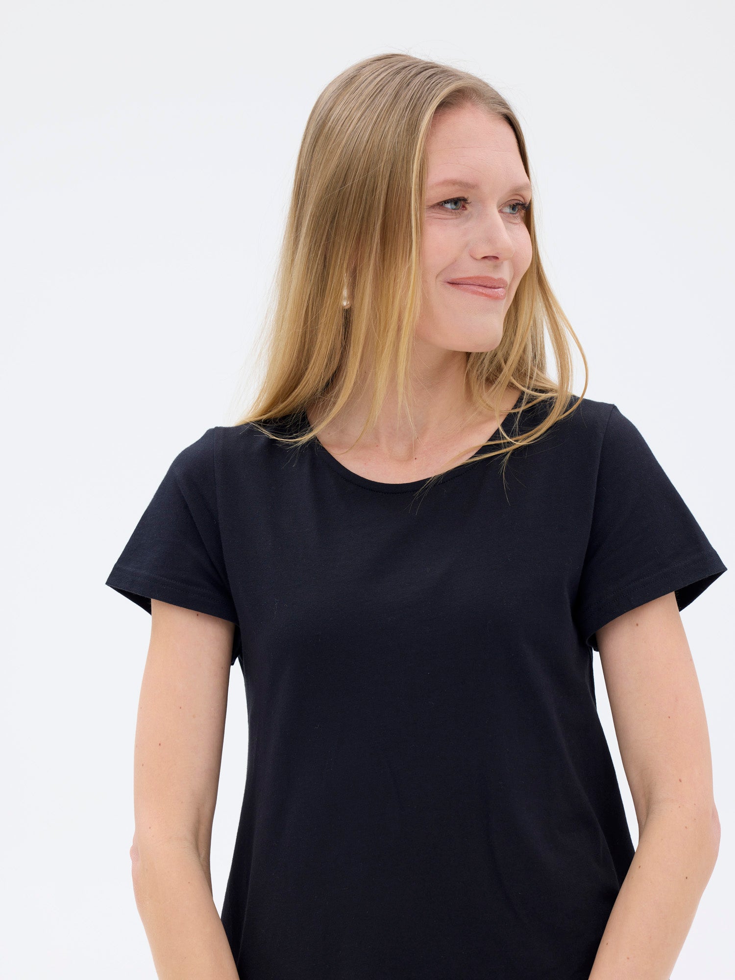 Women's black A-line t-shirt. The shirt has a round neckline, side pockets and short sleeves. The length of the shirt in size M is approximately 79 cm. The material is a pleasant-to-feel and easy-care cotton-elastane knit.