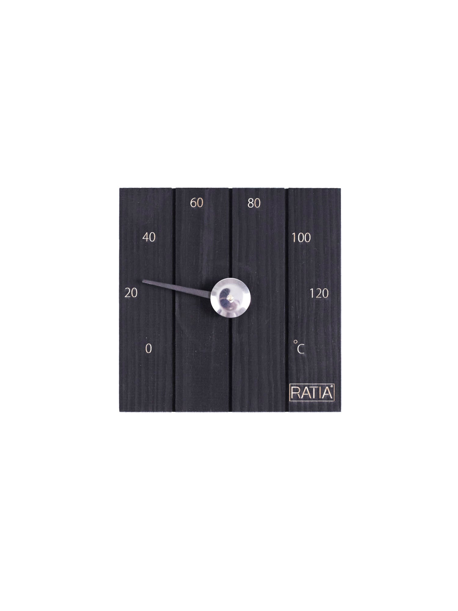 Ratian Laituri series sauna thermometer, made of pine. The wooden part features beautiful grooving and a copper/black mechanism.
