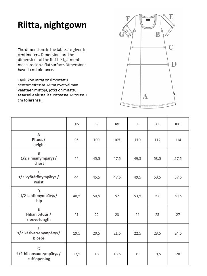Short-sleeved nightie with a slightly a line hem. Stripe width 18 mm * 9 mm. Shirt length is approximately 105 cm in size M. Material is 100% cotton.