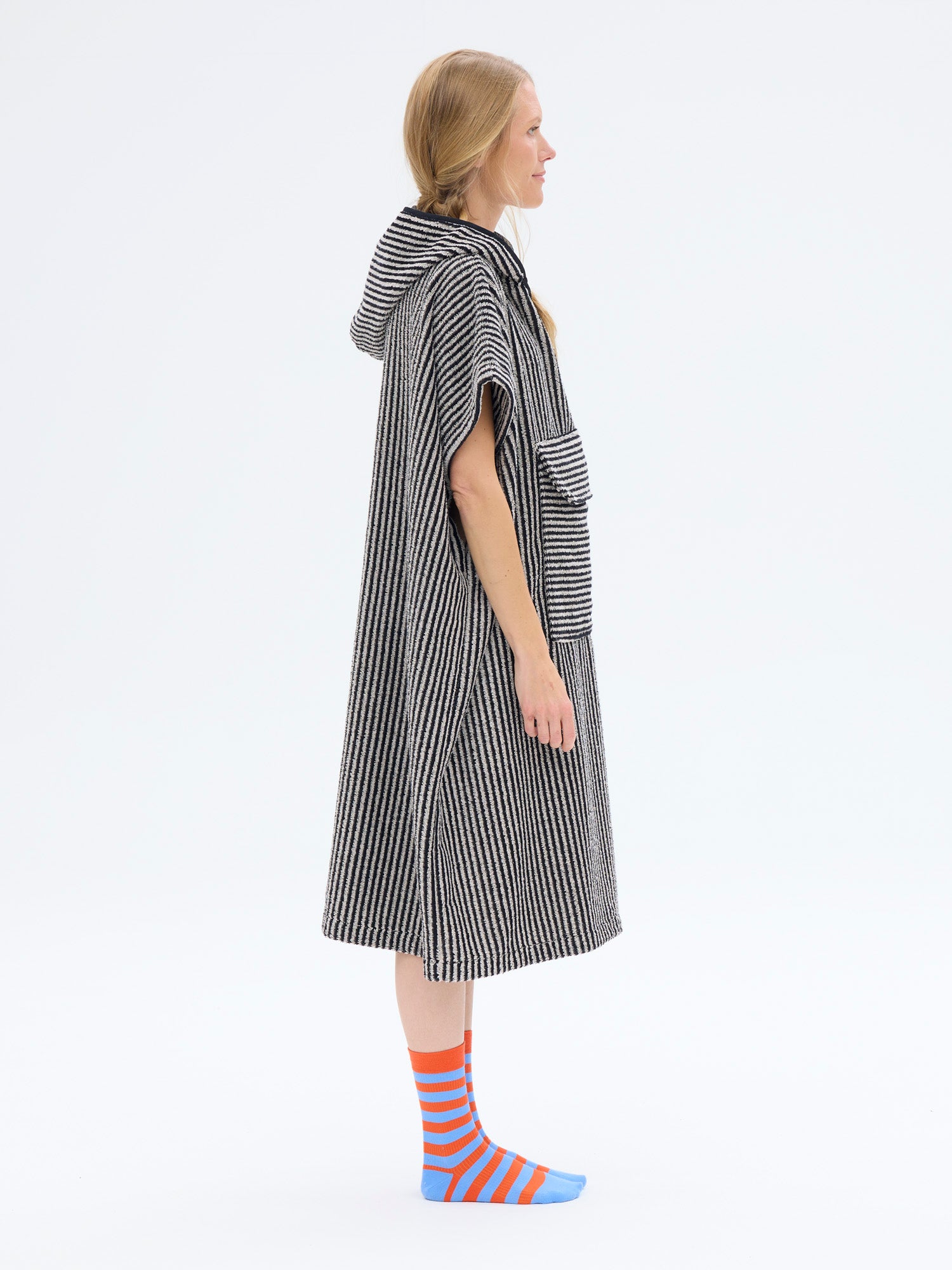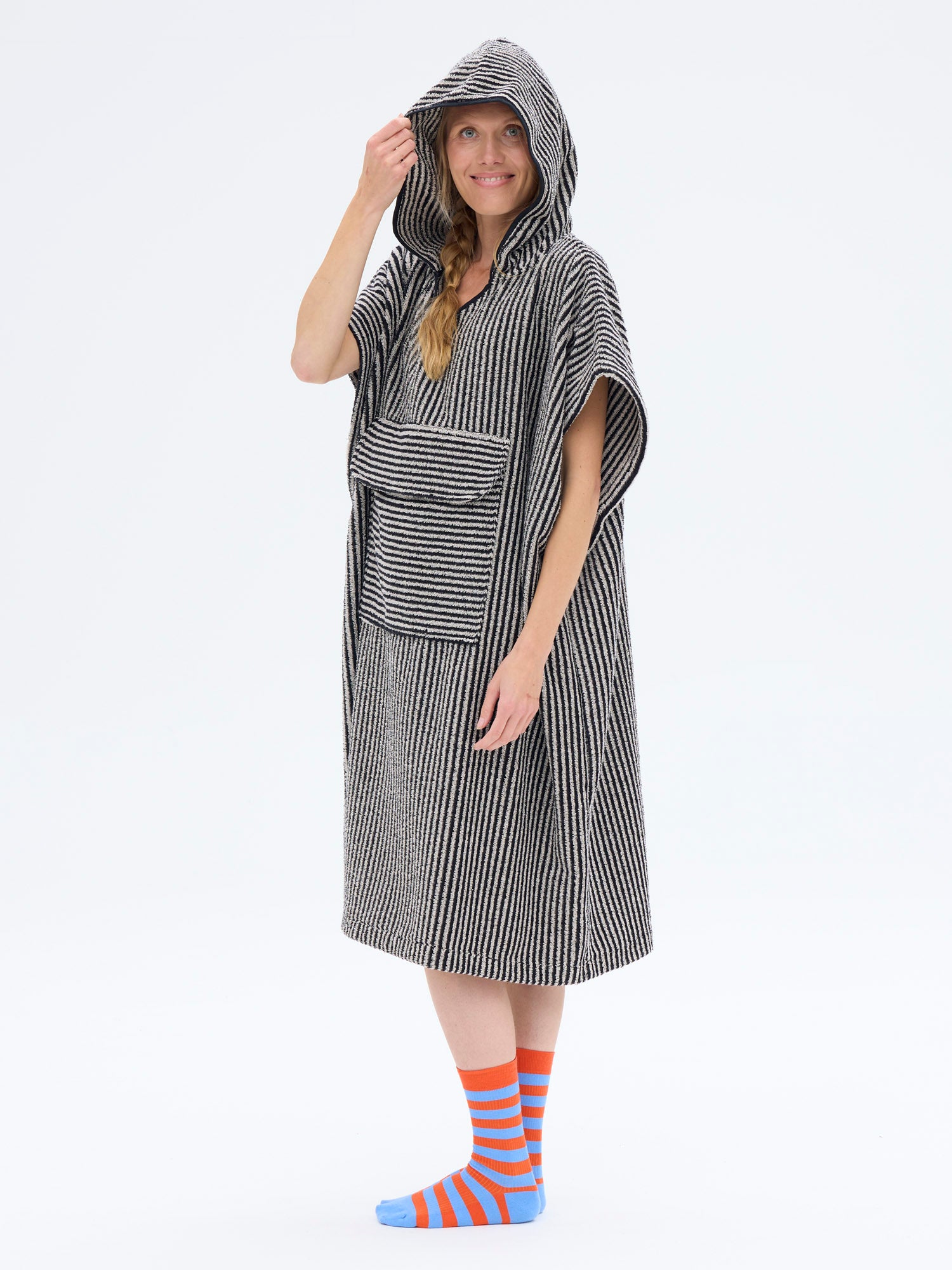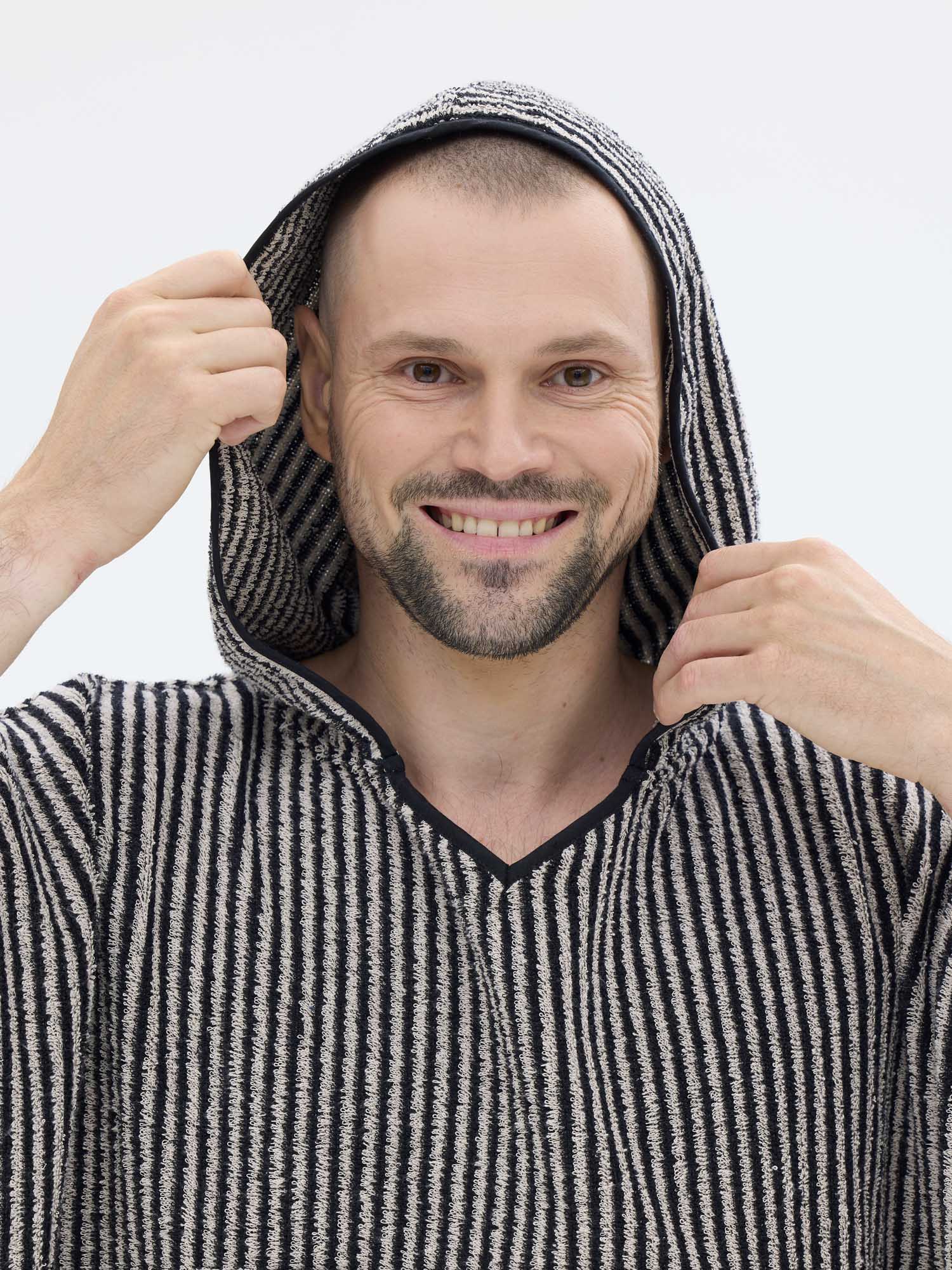 This lightweight terry cloth poncho is easy to slip into after a sauna or swim. The material is soft terry cloth that is absorbent and dries quickly. The poncho has a hood and a handy large pocket in the front. A perfect choice for relaxing after a sauna or on the beach. Stripe width 5 mm. The material is manufactured using LOOP SAFE® technology, which prevents the terry cloth loops from unraveling.