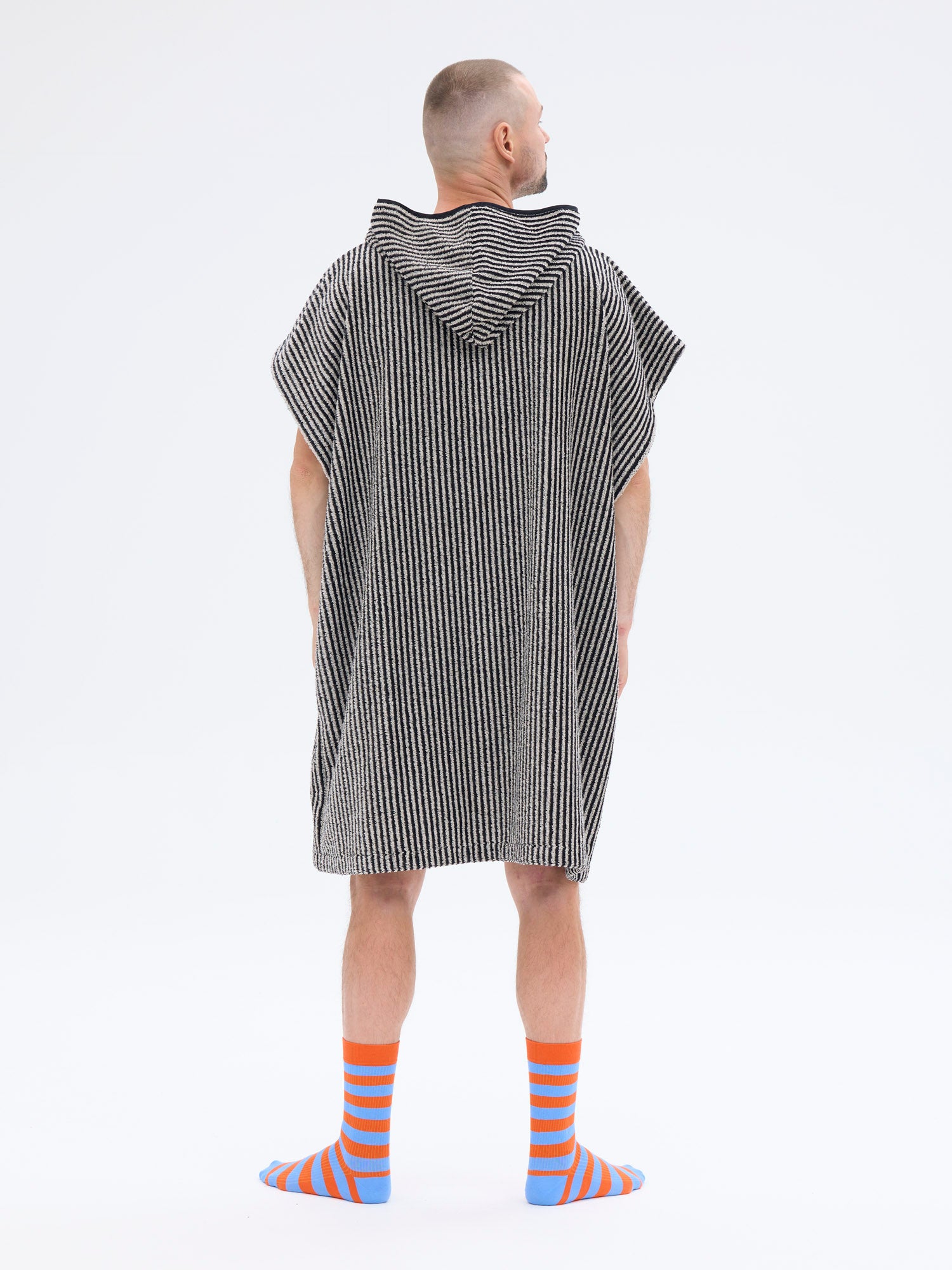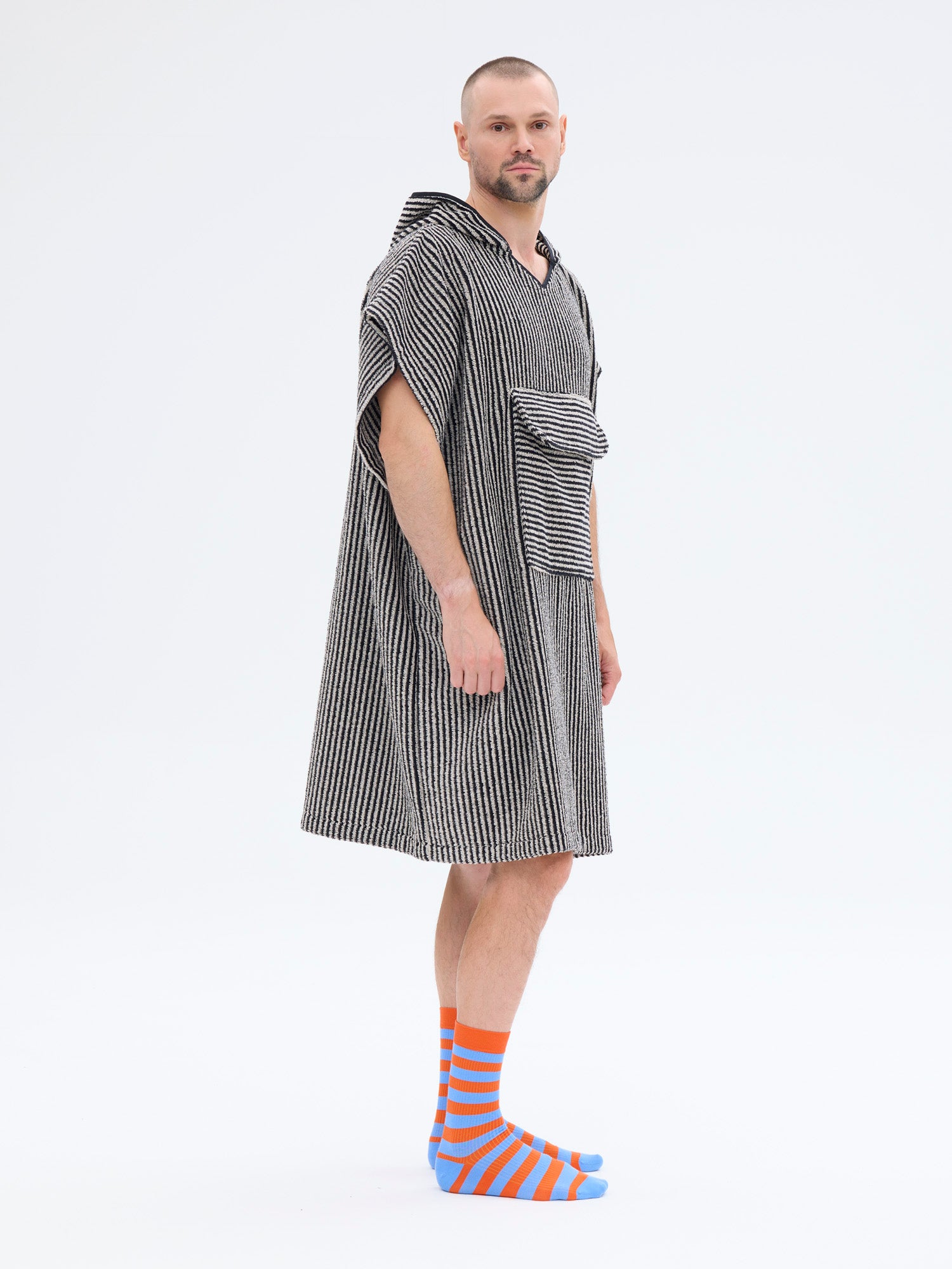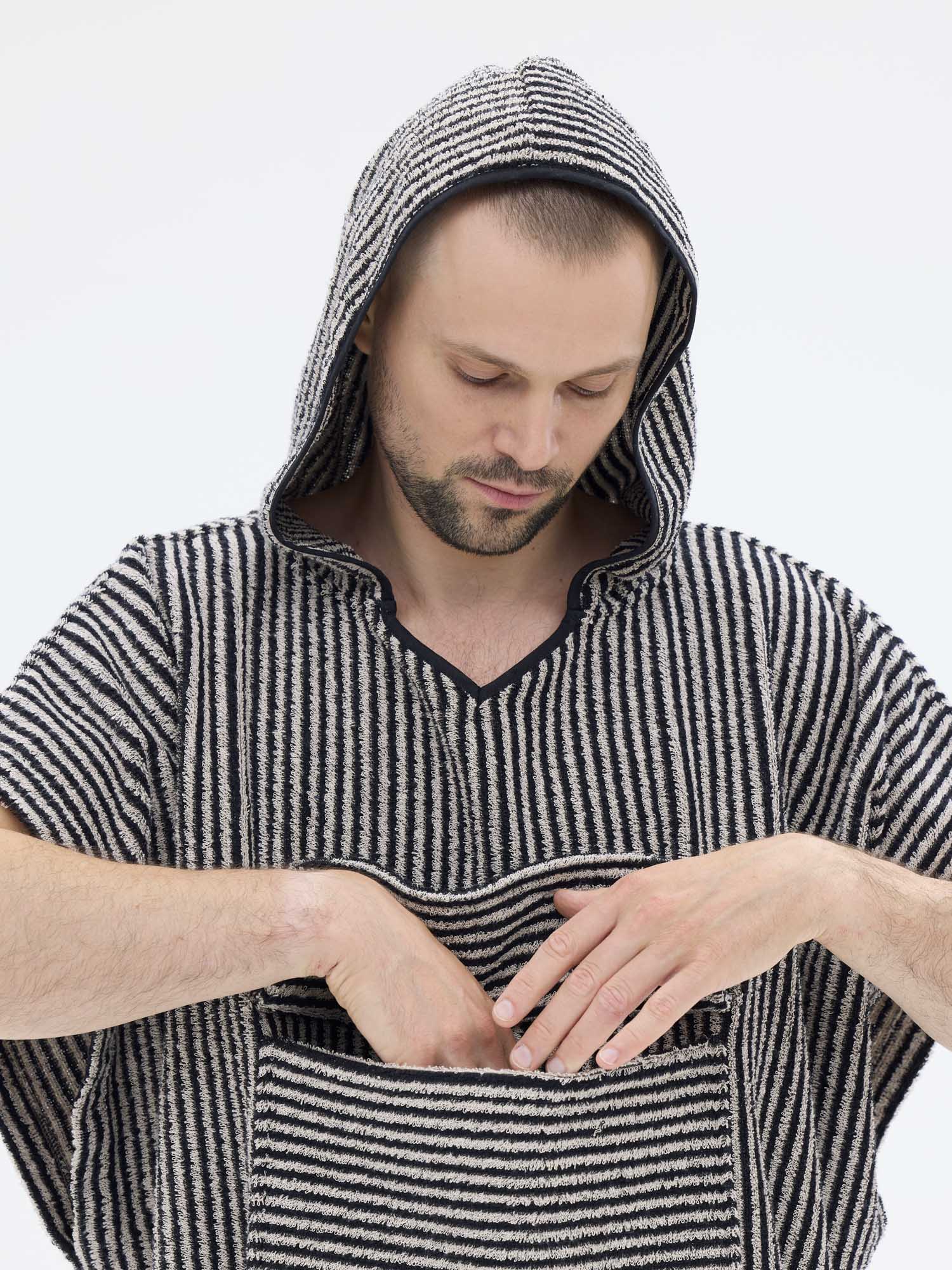 This lightweight terry cloth poncho is easy to slip into after a sauna or swim. The material is soft terry cloth that is absorbent and dries quickly. The poncho has a hood and a handy large pocket in the front. A perfect choice for relaxing after a sauna or on the beach. Stripe width 5 mm. The material is manufactured using LOOP SAFE® technology, which prevents the terry cloth loops from unraveling.