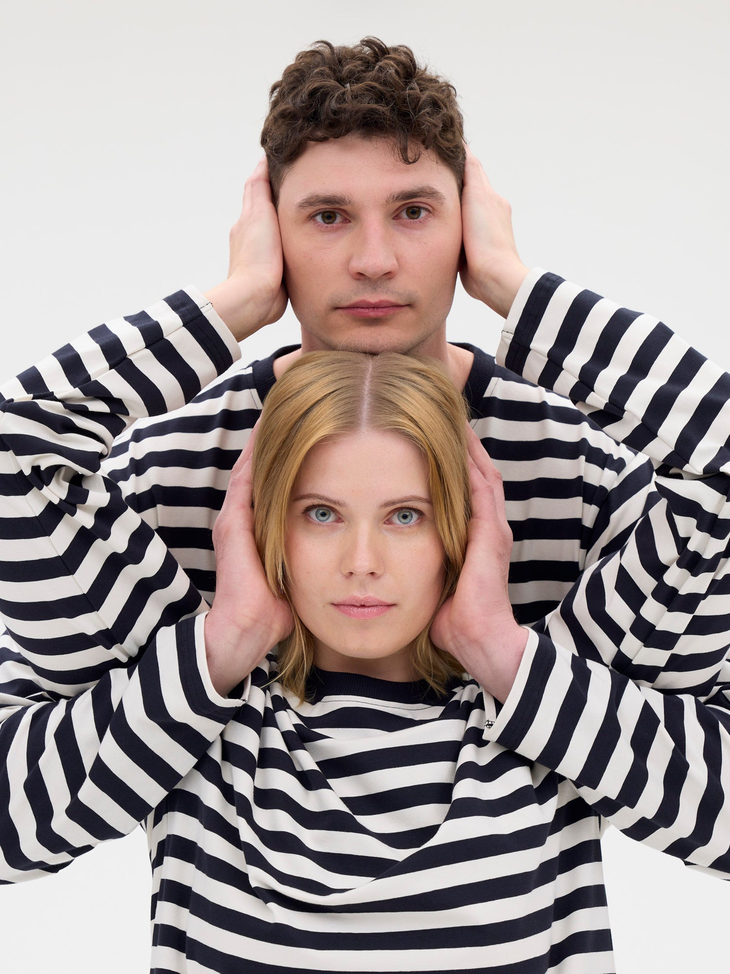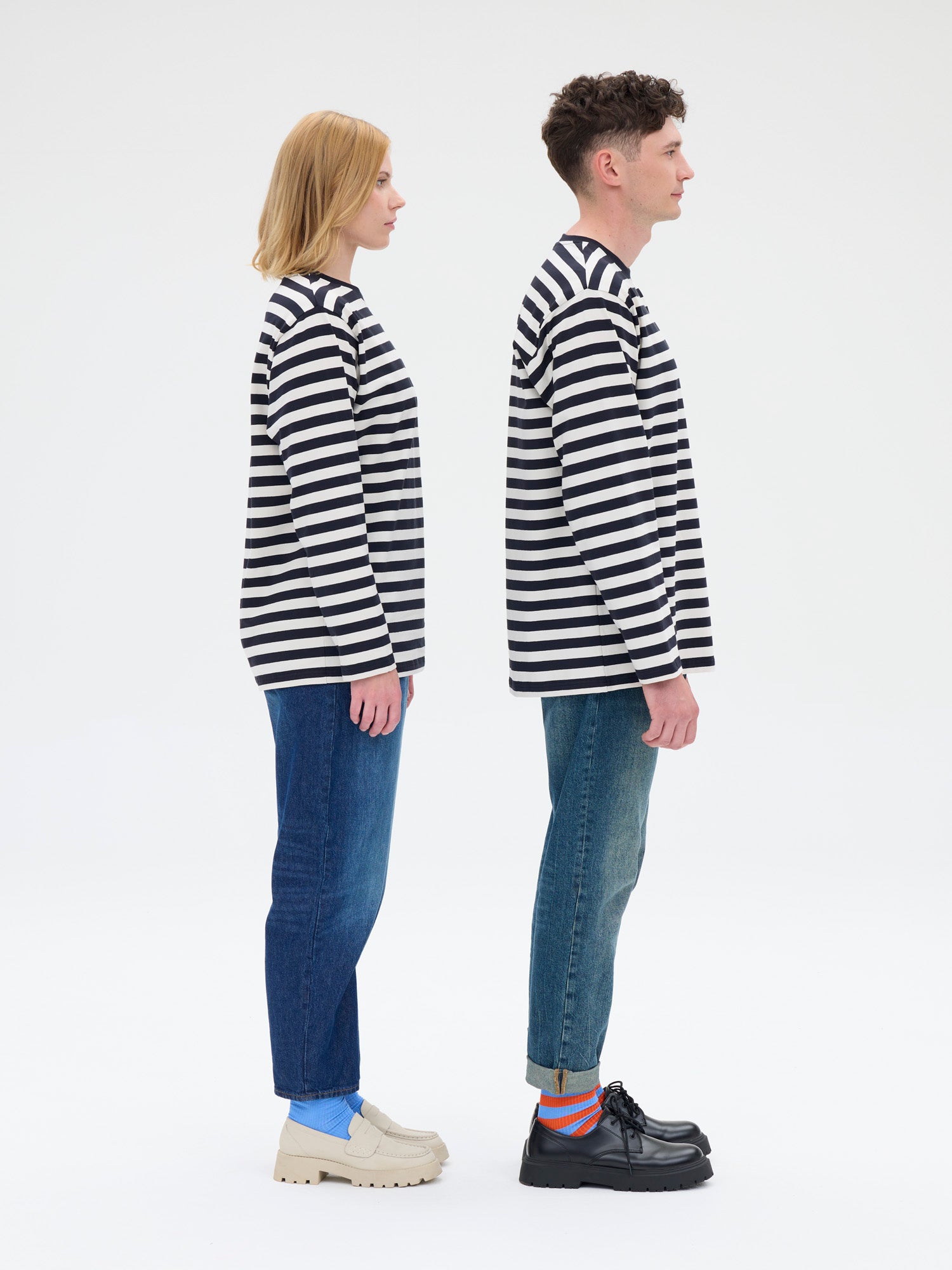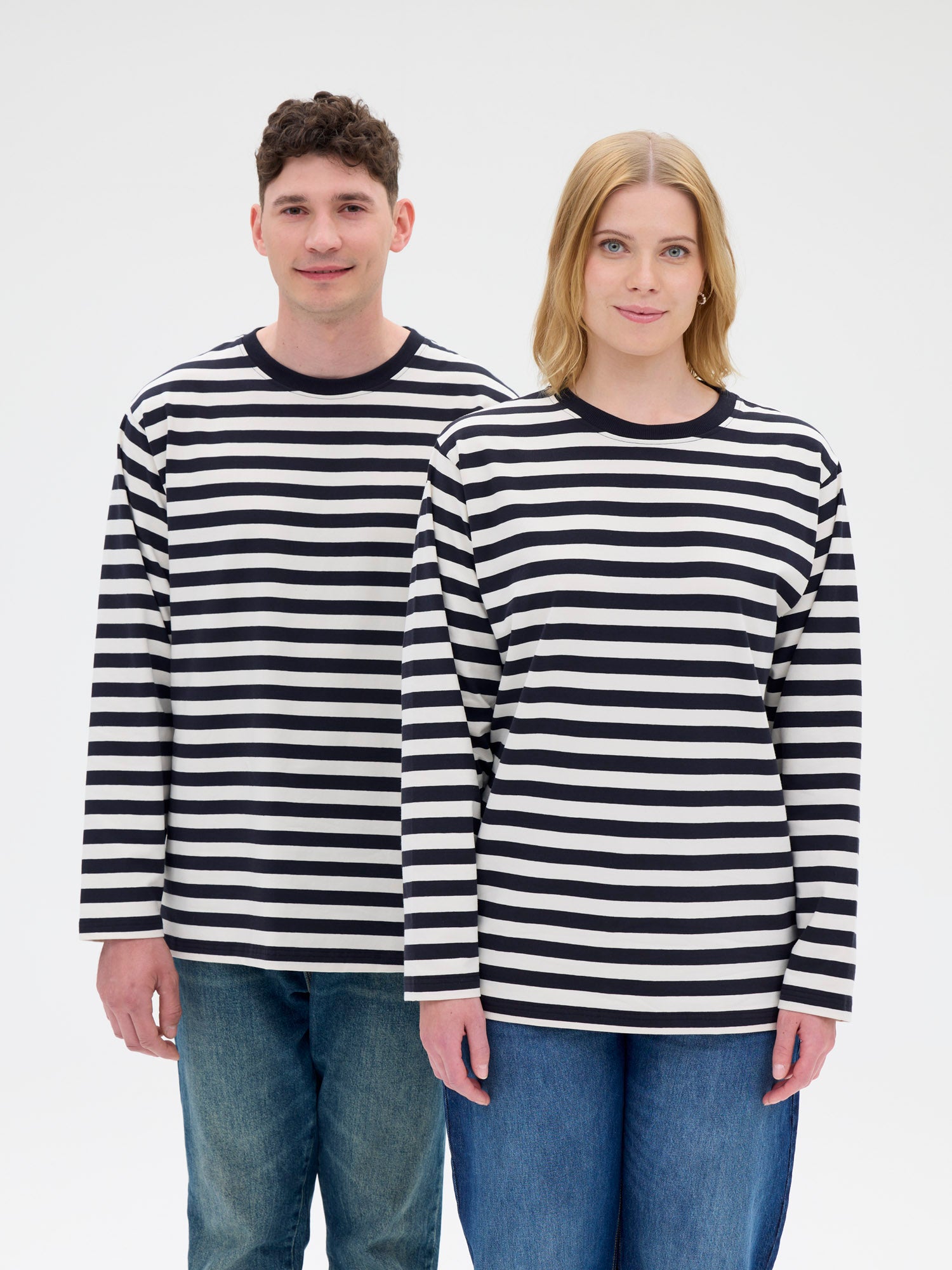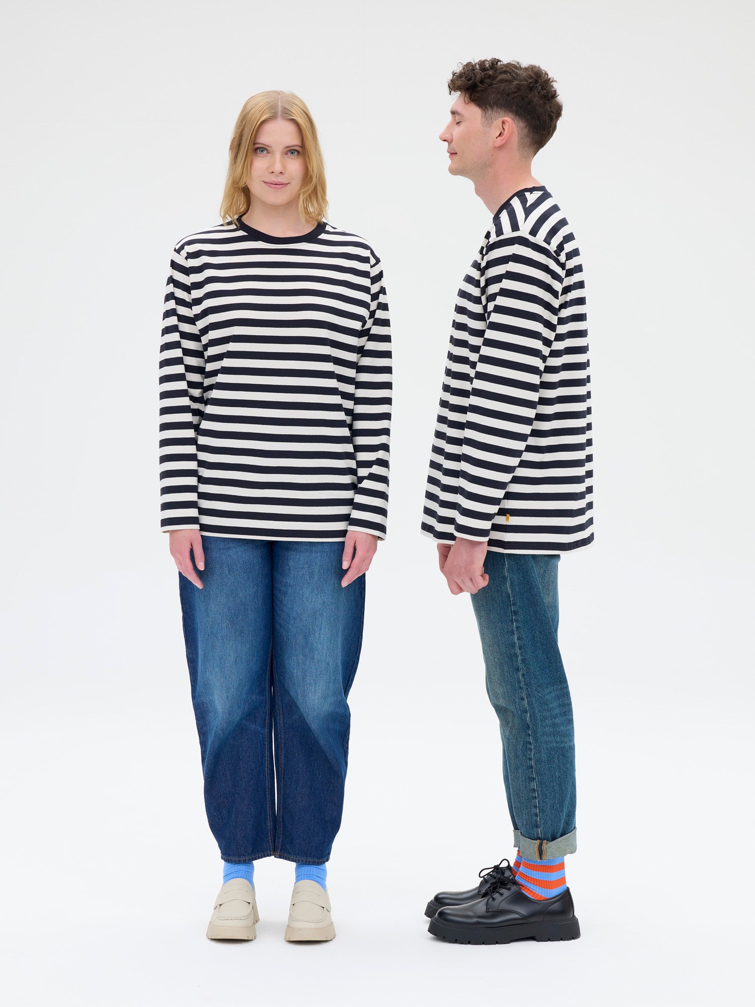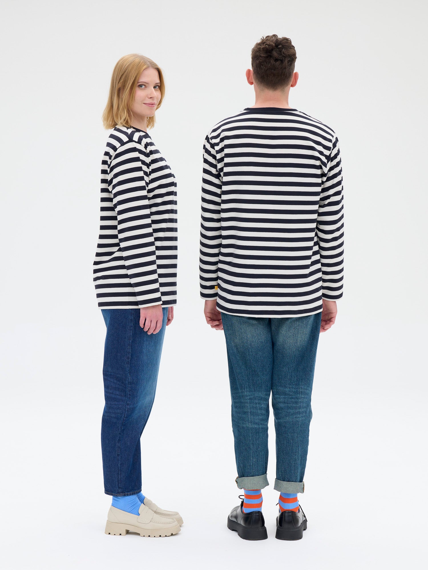 Classic black and white striped unisex shirt for many uses. The width of the stripe is 20 mm. The material is soft tricot, so the shirt is comfortable to wear. The shirt has long sleeves and a round neckline. If you want to buy the shirt for a woman, choose one size smaller than usual. Made in Portugal.
