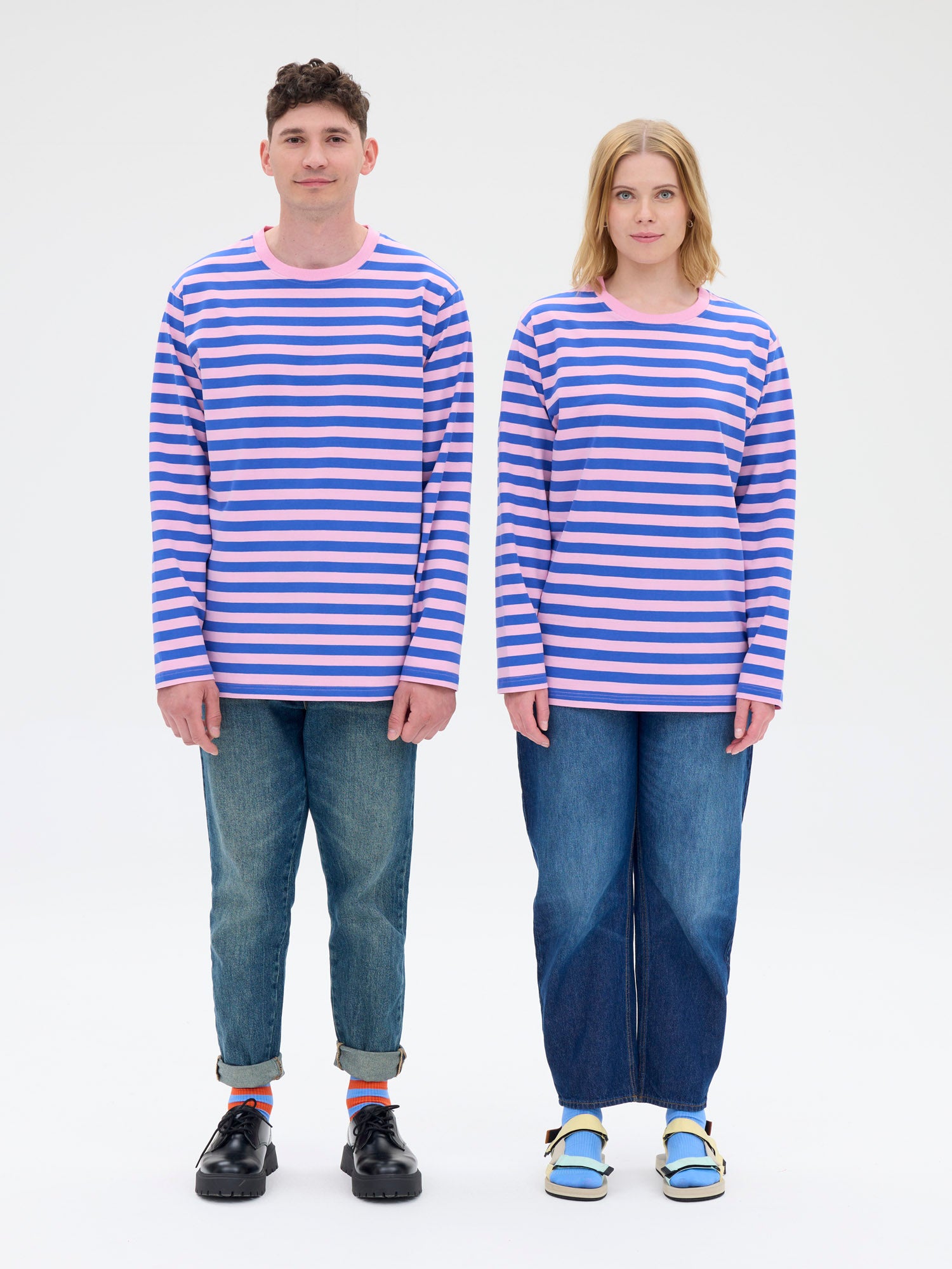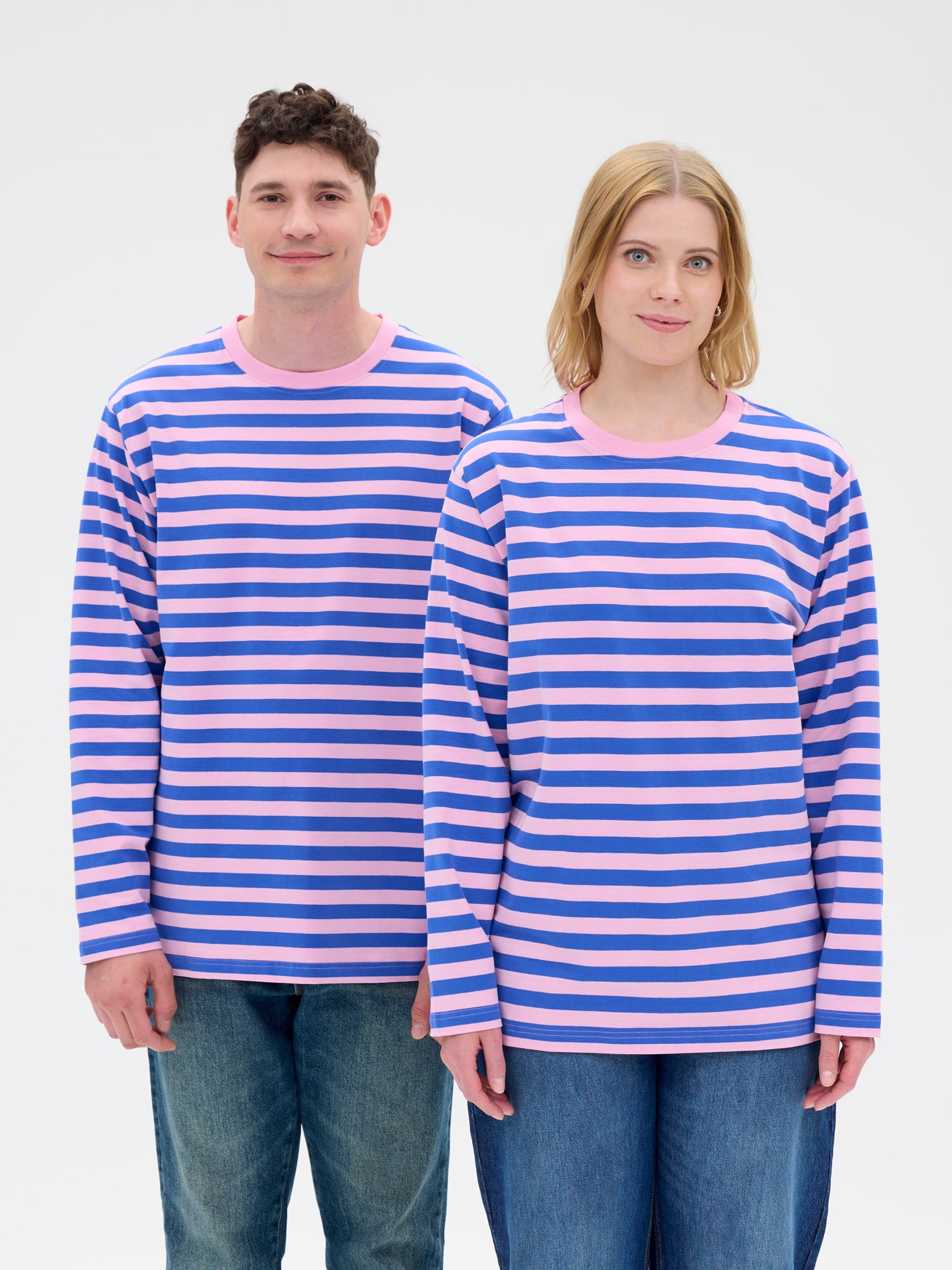 Classic striped unisex shirt with a cheerful pink and blue stripe. The stripe width is 20 mm. The material is soft jersey, so the shirt is comfortable to wear. The shirt has long sleeves and a round neckline. If you want to buy the shirt for a woman, choose one size smaller than usual. Made in Portugal.