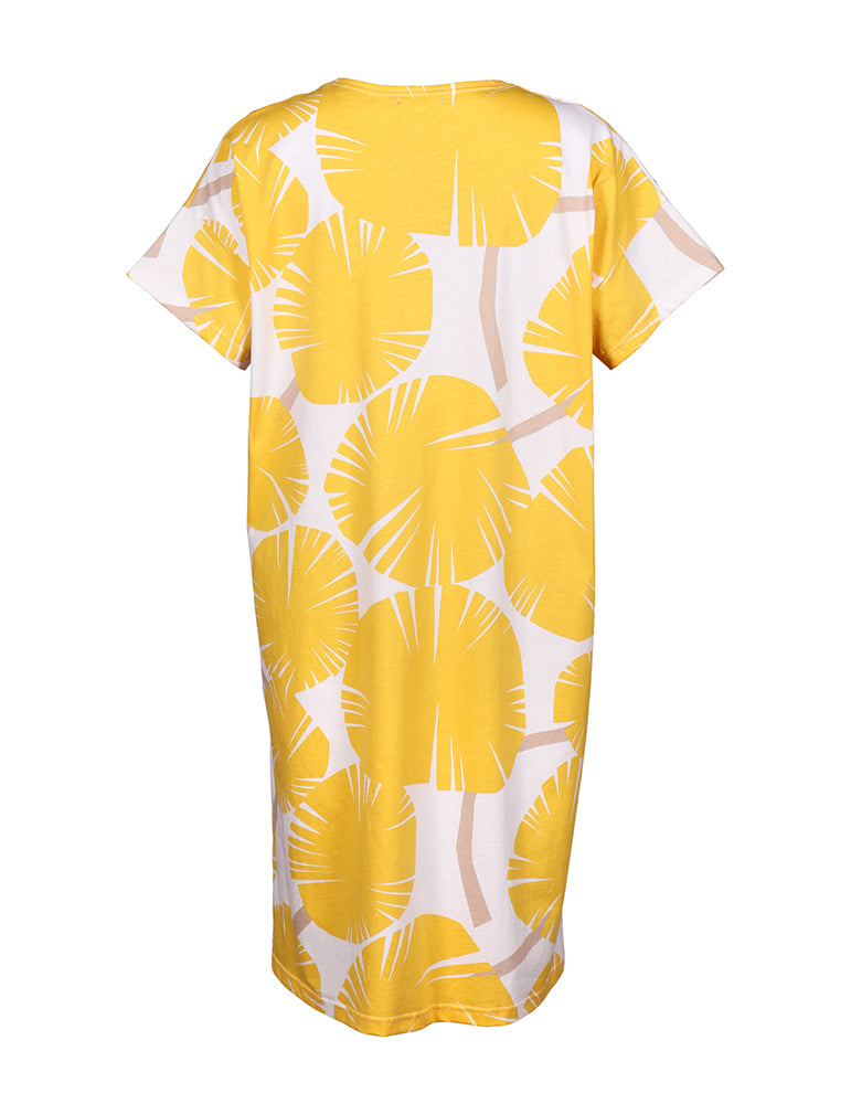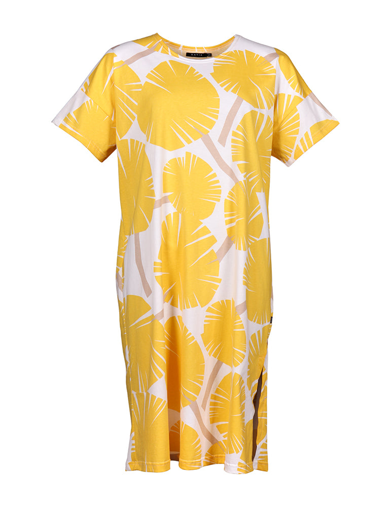 Naisten lyhythihainen, Voikukka-kuosillinen Adina-yöpaita. Materiaali on miellyttävän tuntuista ja helppohoitoista 100 % puuvillaa, joka on iholla pehmeää ja hengittävää materiaalia, mutta jos kaipaat kovin ohutta yöpaitaa, niin tämä materiaali on astetta paksumpaa neulosta. Mekon pituus koossa M on noin 107 cm.