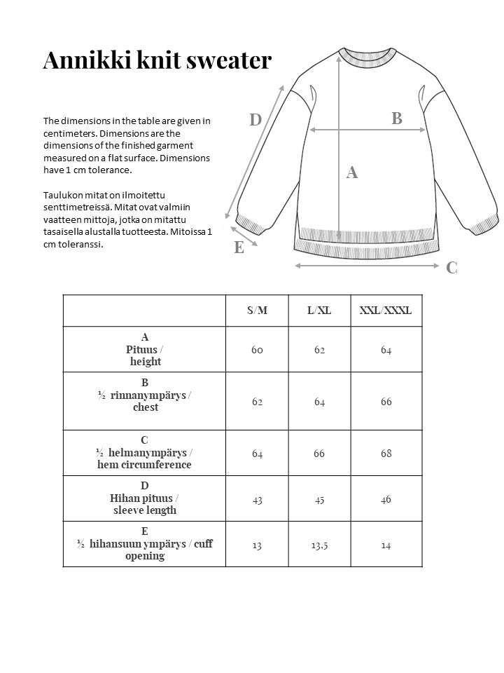 Rento neulepaita pyöreällä pääntiellä, palmikkokuvioinen struktuurineulos. Neuleen sivuilla on pienet halkiot ja takahelma on hieman etuhelmaa pidempi. Pehmeää ja lämmintä villa-polyamidisekoitetta. Kuvan malli on 177 cm pitkä ja hänellä päällä koko S/M.