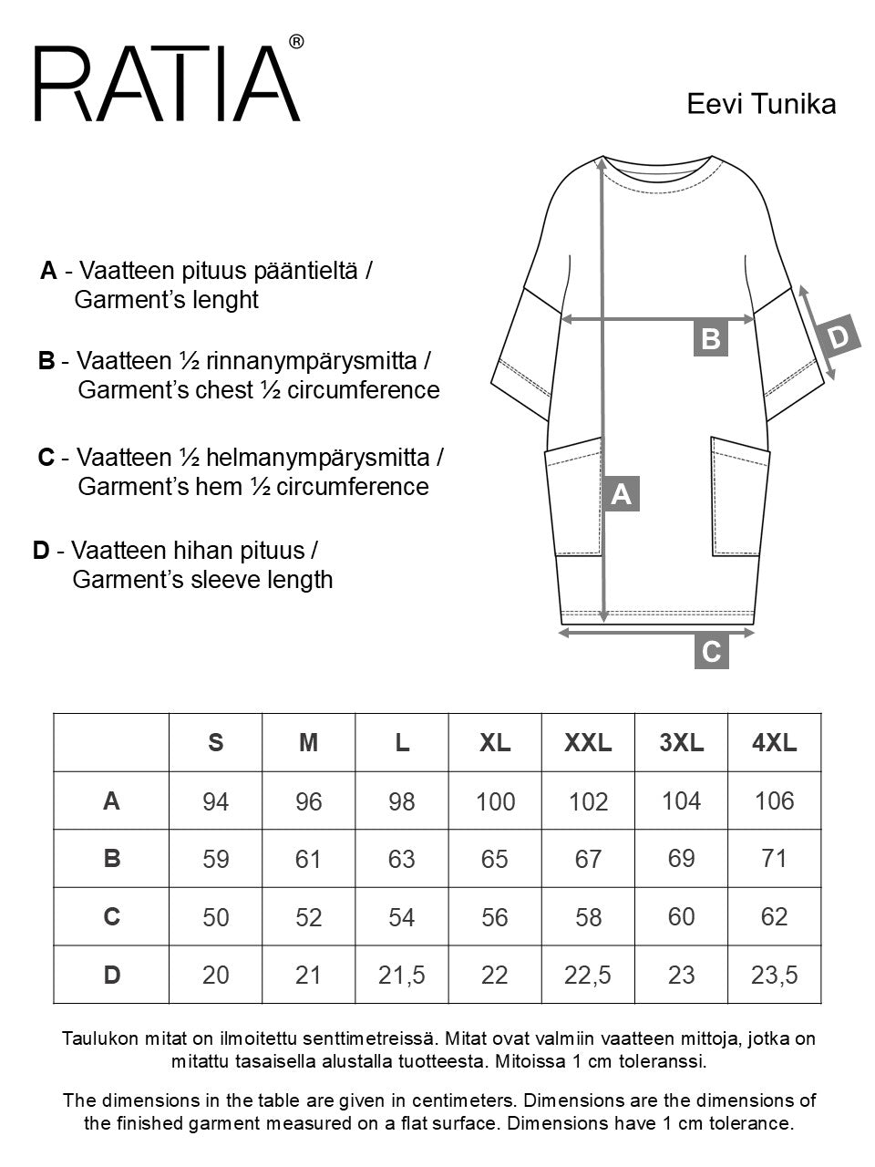 Eevi-tunikassa yhdistyy klassinen tyylikkyys ja rentous. Loistava valinta arkeen, töihin tai vapaa-aikaan. Tunika on helppo yhdistää erilaisten housujen tai hameiden pariksi. Erilaisilla koruilla ja asusteilla saat tuotua uutta ilmettä kokonaisuuteen. Tunikassa on isot taskut edessä, hieman oversize-malli, laskettu olka, leveähkö pääntie ja ¾ -hiha. Tunikan pituus on noin puoleen reiteen. Valmistettu Portugalissa.