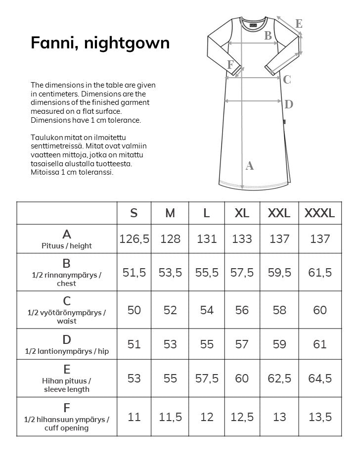 Pitkähihainen pitkä yöpaita. Raidan leveys 50 x 50 mm. Yöpaidan malli on alaspäin levenevä ja helmassa sivulla oleva halkio tuo käyttömukavuutta. Yöpaidan pituus on noin 128 cm koossa M. Materiaali on miellyttävää 100 % luomupuuvillaa, joka on sopivan ohutta, iholla pehmeää ja hengittävää materiaalia.