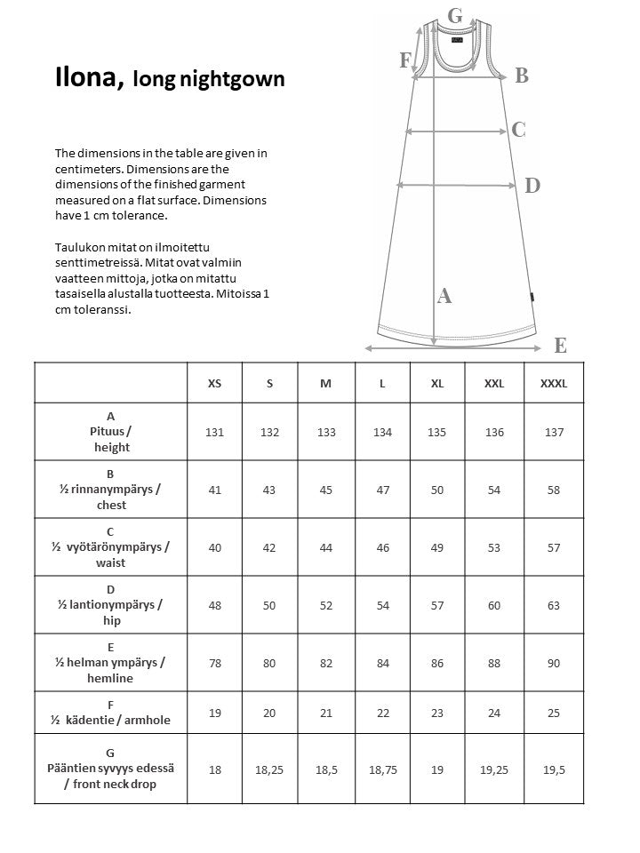 Naisten hihaton pitkä trikoinen yöpaita. Yöpaidan malli on alaspäin levenevä. Raidan leveys on 40 x 40 mm. Yöpaidan pituus on noin 133 cm koossa M. Materiaali on miellyttävää 100 % puuvillaa. Tuote on valmistettu Portugalissa.