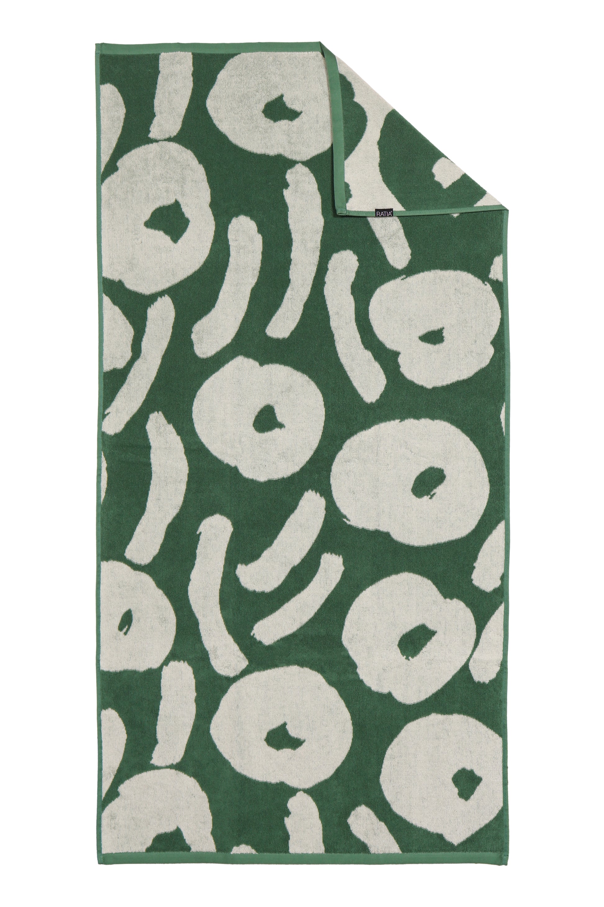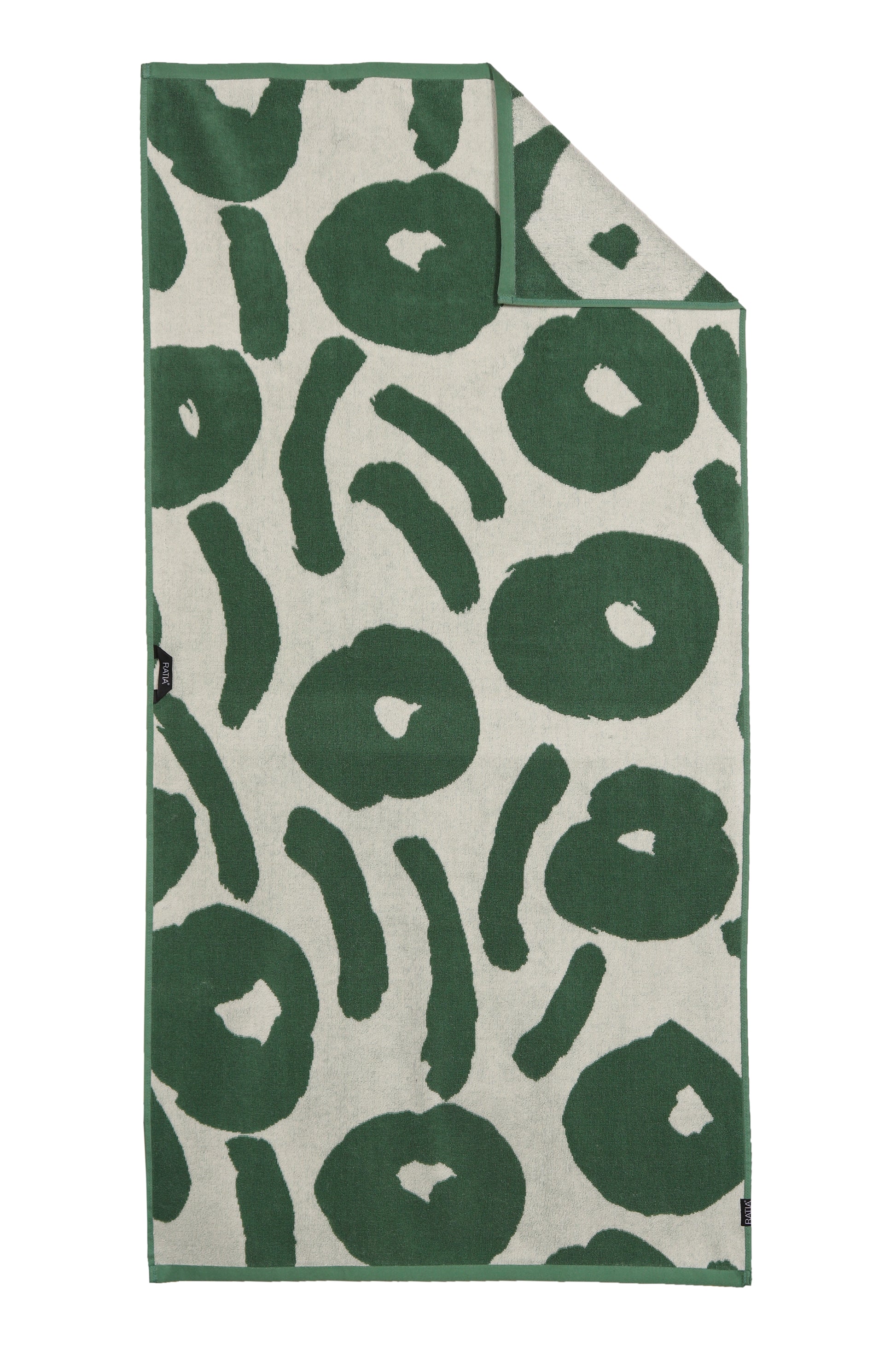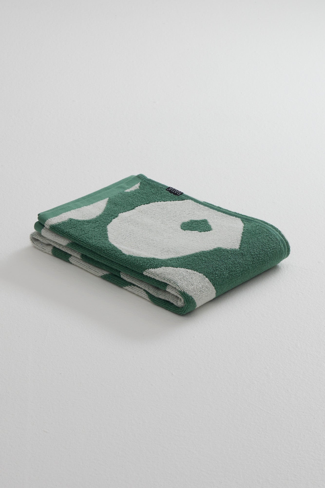 Kuosillinen vihreä-valkoinen Nuppunen kylpypyyhe ihaniin saunahetkiin. Materiaali on 100 % puuvillaa. Pyyhkeen koko on 70 x 140 cm.