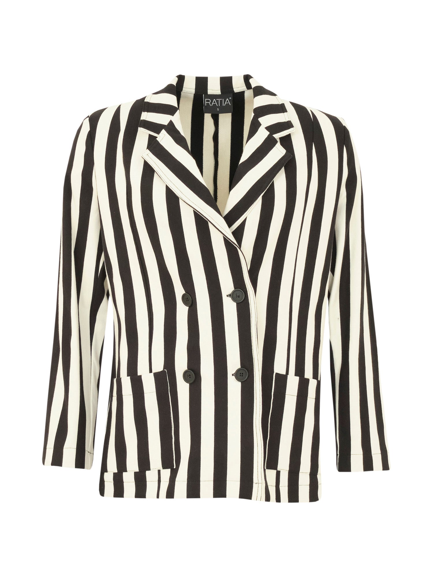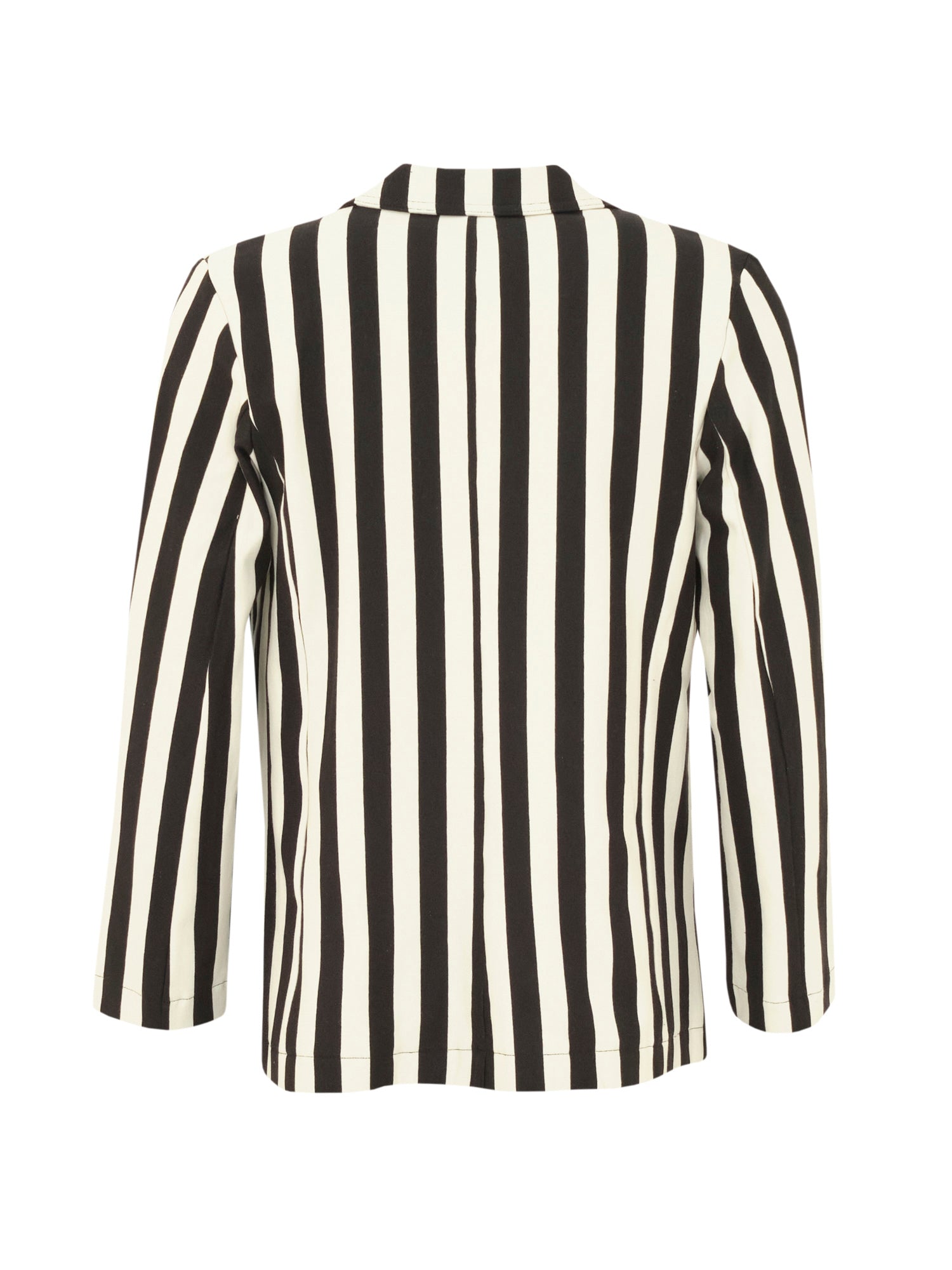 Naisten tyylikäs musta-valko raitainen Luisa jakku on supermukava päällä, ja antaa asullesi viimeistellyn vaikutelman. Ajaton jakku on helppo yhdistää erilaisten housujen, hameiden tai mekkojen pariksi. Jakussa on edessä kaksirivinen nappikiinnitys. Jakussa on leikkaukset edessä ja takana, jotka tekevät mallista ryhdikkään ja istuvan päällä. Hihat ovat täyspitkät. Edessä paikkataskut. Raidan leveys 20 x 20 mm. Materiaali on pehmeää, trikoota hieman vahvempaa ja ryhdikkäämpää joustocollegea, joka on helppohoitoista ja mukavan tuntuista päällä. Valmistettu Portugalissa.