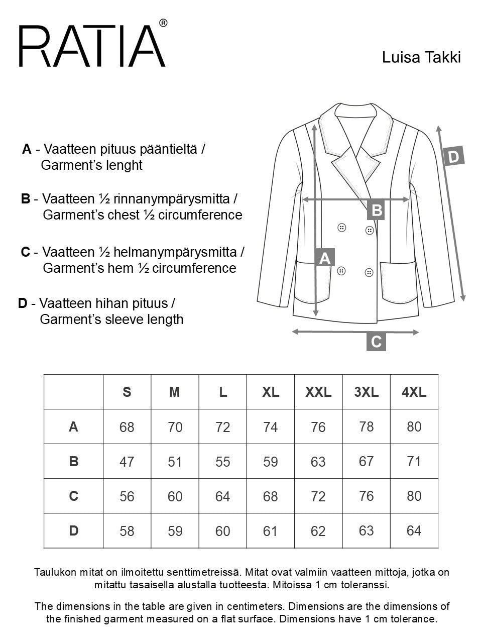 Naisten tyylikäs musta-valko raitainen Luisa jakku on supermukava päällä, ja antaa asullesi viimeistellyn vaikutelman. Ajaton jakku on helppo yhdistää erilaisten housujen, hameiden tai mekkojen pariksi. Jakussa on edessä kaksirivinen nappikiinnitys. Jakussa on leikkaukset edessä ja takana, jotka tekevät mallista ryhdikkään ja istuvan päällä. Hihat ovat täyspitkät. Edessä paikkataskut. Raidan leveys 20 x 20 mm. Materiaali on pehmeää, trikoota hieman vahvempaa ja ryhdikkäämpää joustocollegea, joka on helppohoitoista ja mukavan tuntuista päällä. Valmistettu Portugalissa.