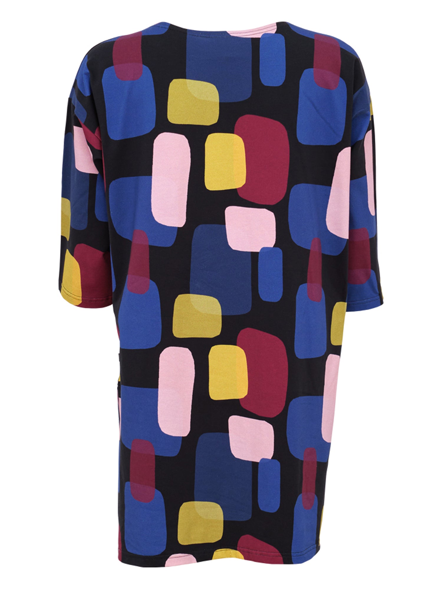 Naisten värikäs kuosillinen Muumaa-tunika. Tunikassa on pyöreä pääntie ja sivuilla halkiot. Tunikan takaosa on helmastaan etuosaa pidempi. Tunikaa voit yhdistellä kivasti erilaisten housujen kuten legginsien ja farkkujen kanssa. Tunikan pituus koossa M on noin 84 cm. Materiaalin on miellyttävän tuntuista ja helppohoitoista puuvilla-elastaani-neulosta.