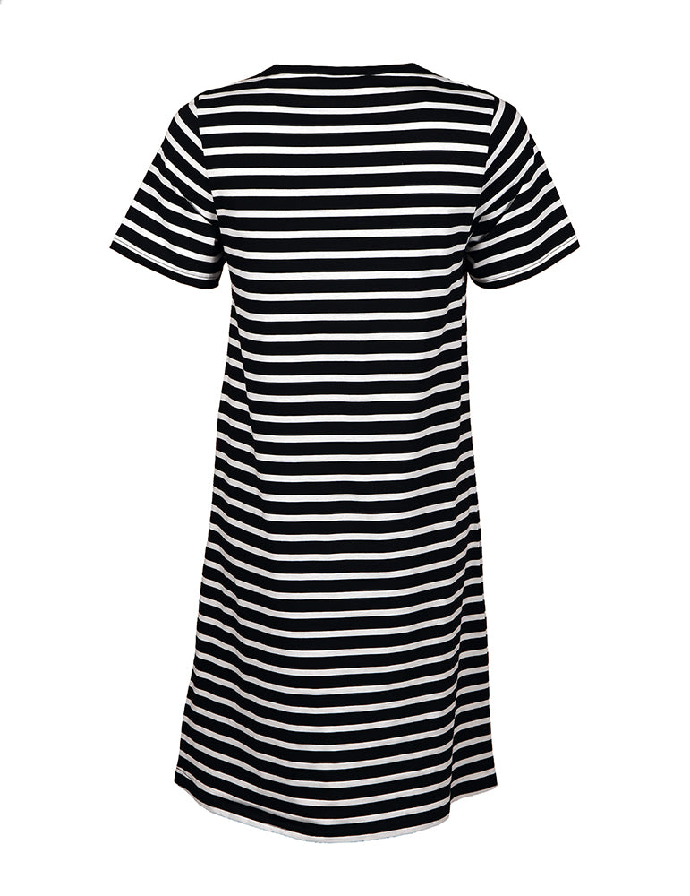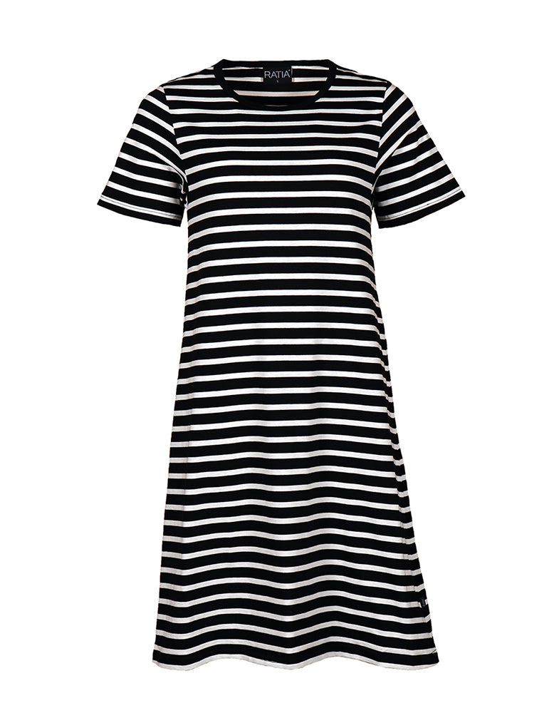 Naisten lyhythihainen klassikkoraitainen trikoopaituli. Raidan leveys on 18 x 9 mm. Paitulin pituus on noin 104 cm koossa M. Paitulin materiaali on käytössä miellyttävää 100 % puuvillaa.