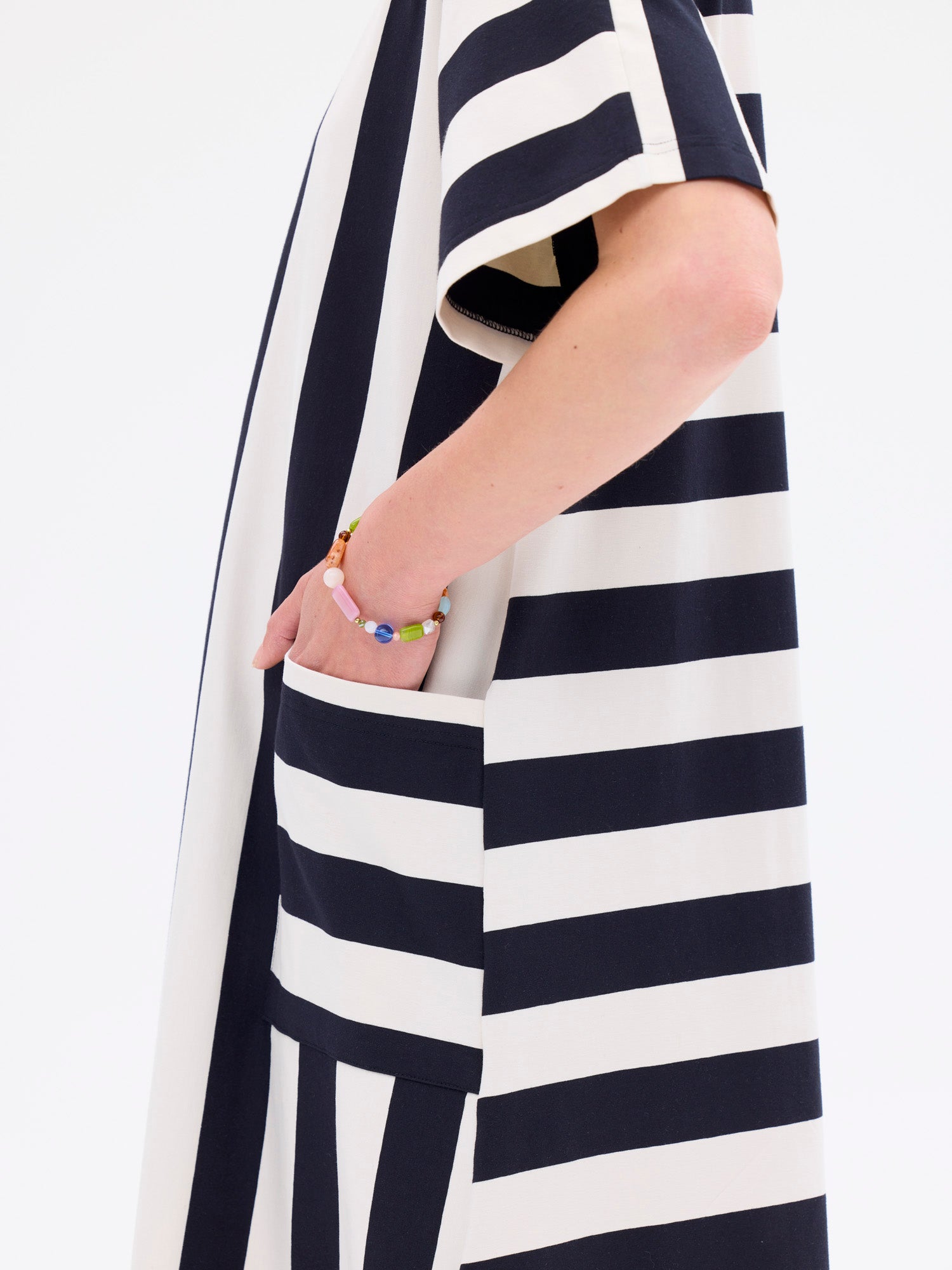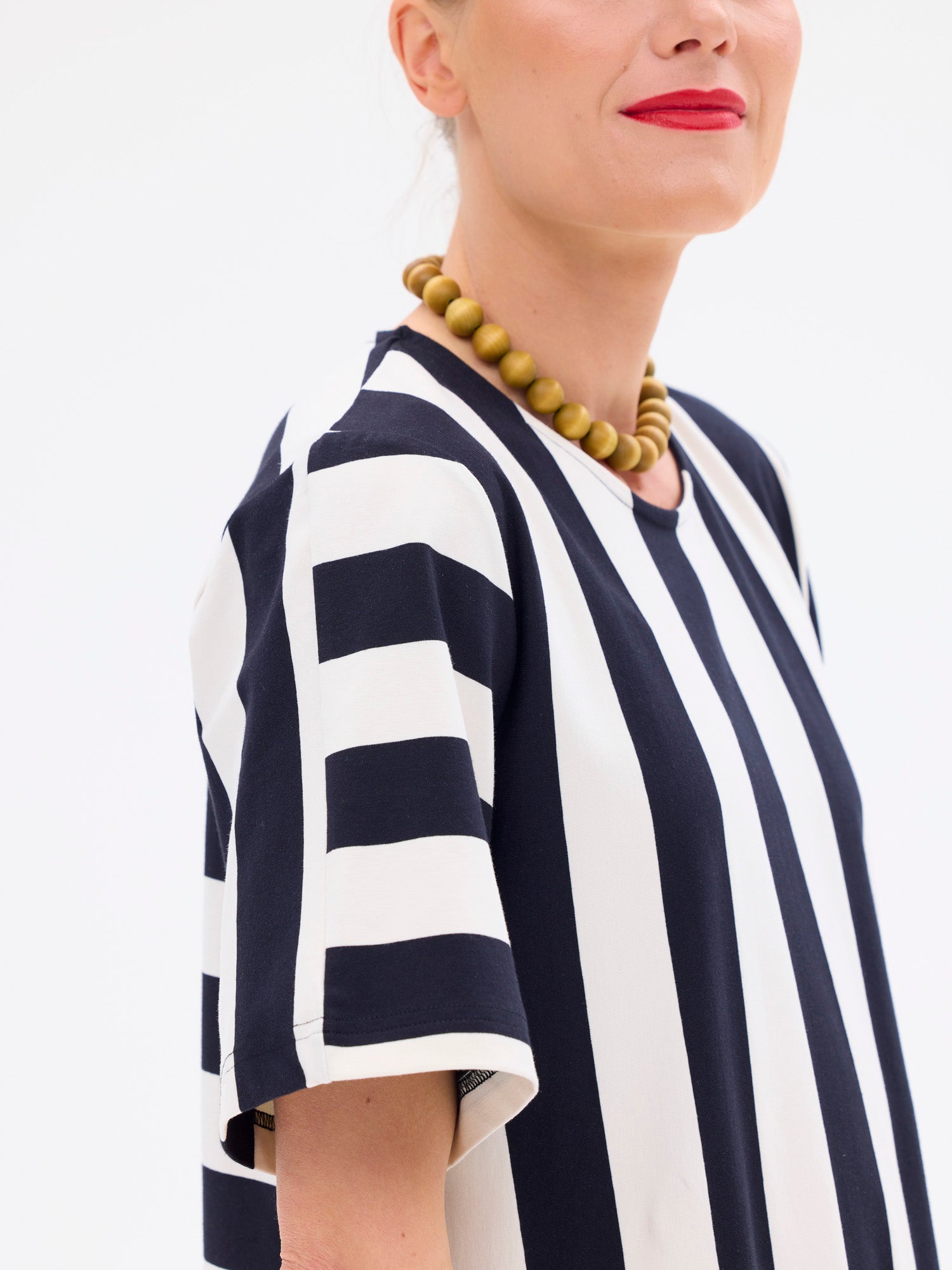 Naisten A-linjainen maksimekko t-paita hihoilla. Mekossa on leikitelty 40 x 40 mm musta-valko raidoilla niin, että edessä on musta-valkoinen pystyraidoitus, ja takana raidat ovat vaakasuorassa. Helmassa sivuilla on raidoista tehdyt yksityiskohdat. Mekossa istuvampi yläosa, ja väljä helma. Edessä taskut, joissa raidat ovat vaakasuorassa.