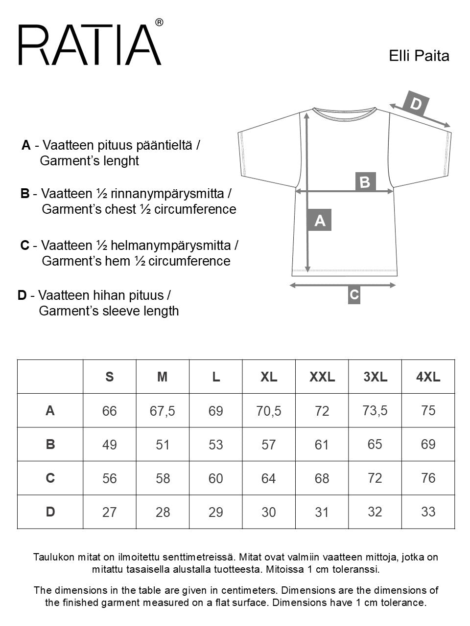 Musta Elli t-paita on helppo ja monikäyttöinen valinta arjen eri tilanteisiin, niin töihin kuin vapaa-aikaan! Yksivärinen t-paita on helppo yhdistää asuun kuin asuun. Paita on malliltaan rento, jossa on lepaamaiset hihat jotka ei purista käsivarsista. Puuvilla-elastaani trikoo on helppohoitoinen ja mukavan tuntuinen materiaali ihoa vasten. Elastaani tuo mukavaa pientä joustoa t-paitaan. Trikoo on hieman napakampaa, mutta laskeutuu kuitenkin kauniisti. Lyhyet hihat ja pyöreä pääntie, helma yltää reilusti lantiolle. Katso oikea koko mittataulukostamme. Valmistettu Portugalissa.