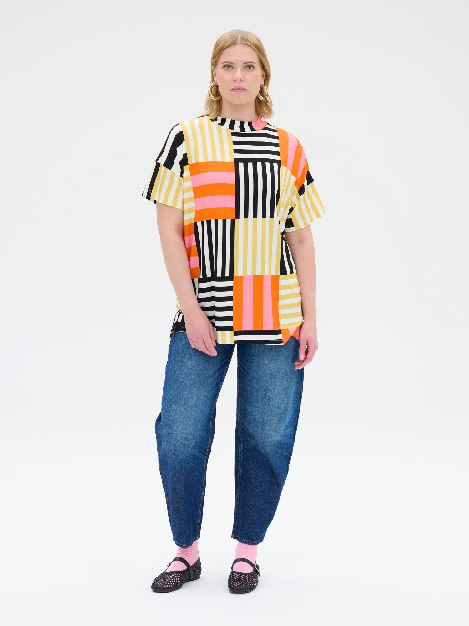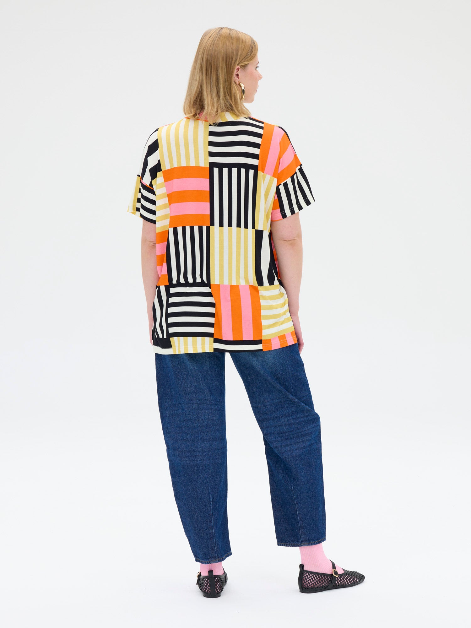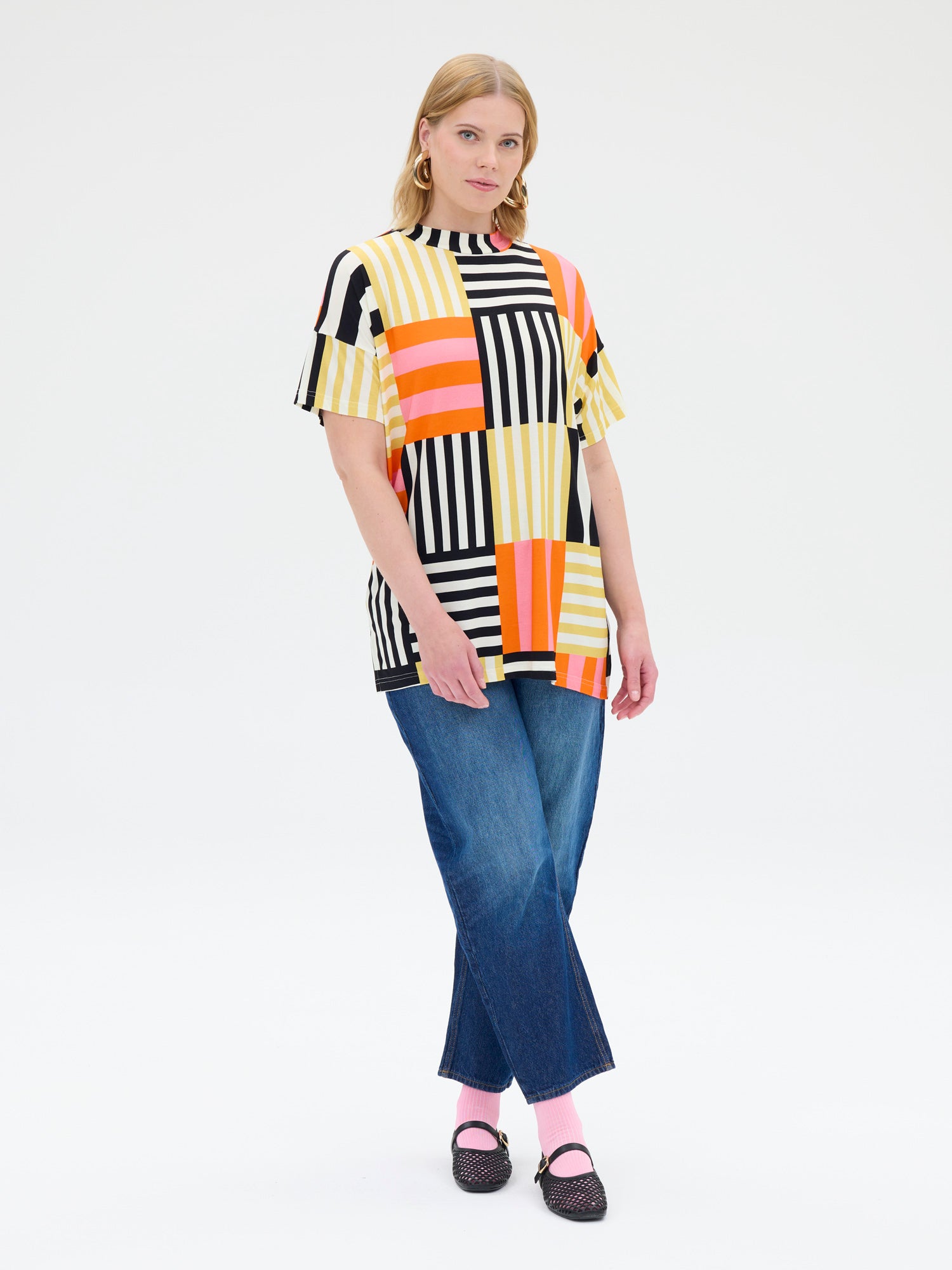 Naisten lyhythihainen paita Tilkkutäkki-kuosilla. Laatikkomainen, väljä malli, jossa hieman korkeampi pääntie ja lyhyet hihat. Molemmilla sivuilla pienet halkiot. Materiaali tuntuu mukavan pehmeältä ja viileältä päällä. Tuote valmistettu Portugalissa.