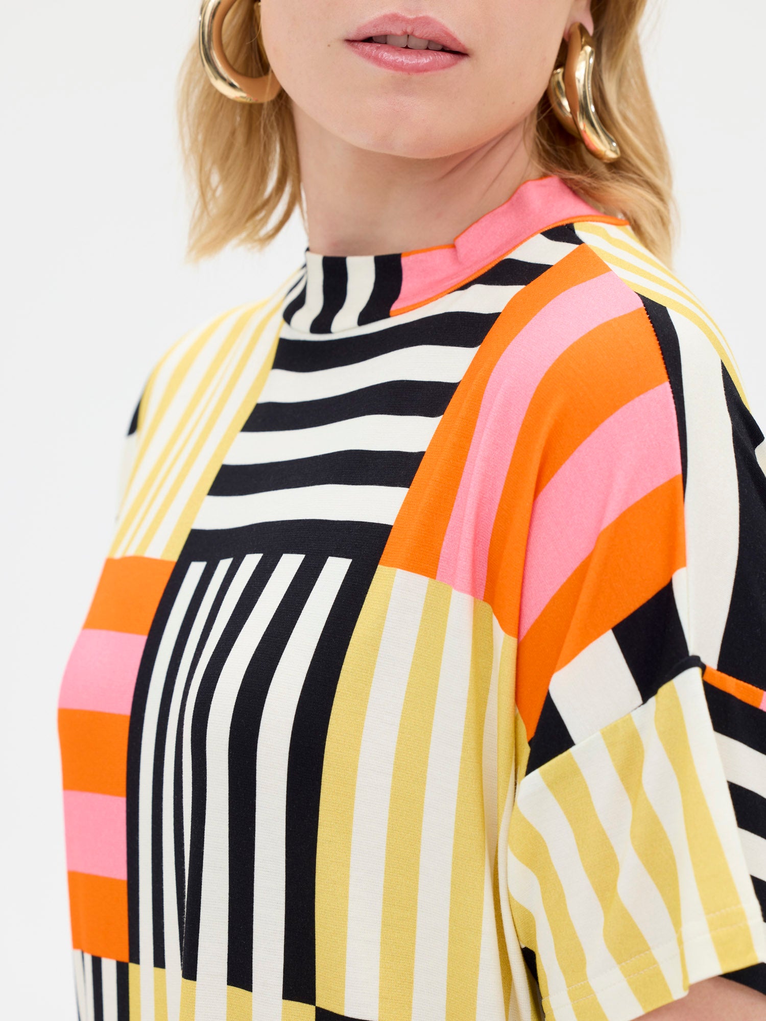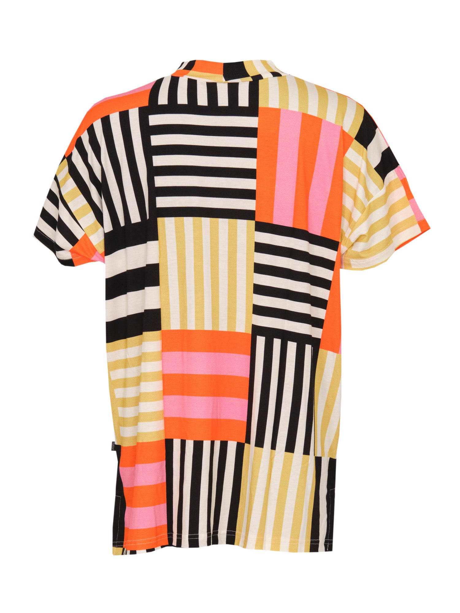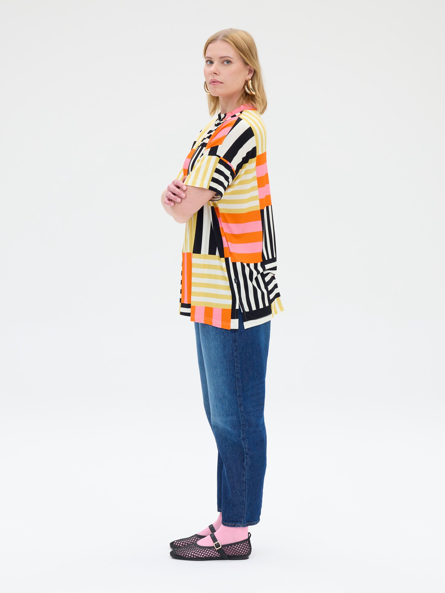 Naisten lyhythihainen paita Tilkkutäkki-kuosilla. Laatikkomainen, väljä malli, jossa hieman korkeampi pääntie ja lyhyet hihat. Molemmilla sivuilla pienet halkiot. Materiaali tuntuu mukavan pehmeältä ja viileältä päällä. Tuote valmistettu Portugalissa.