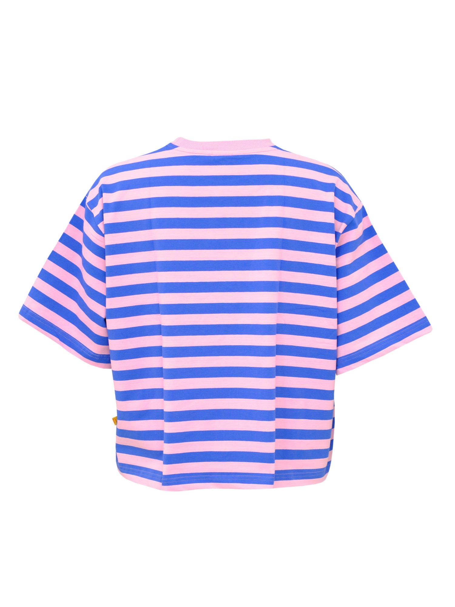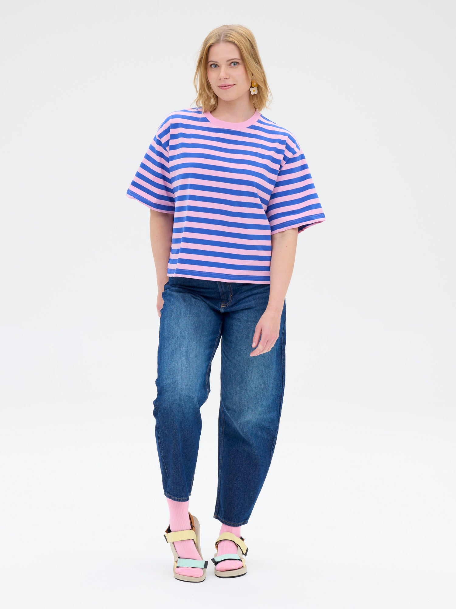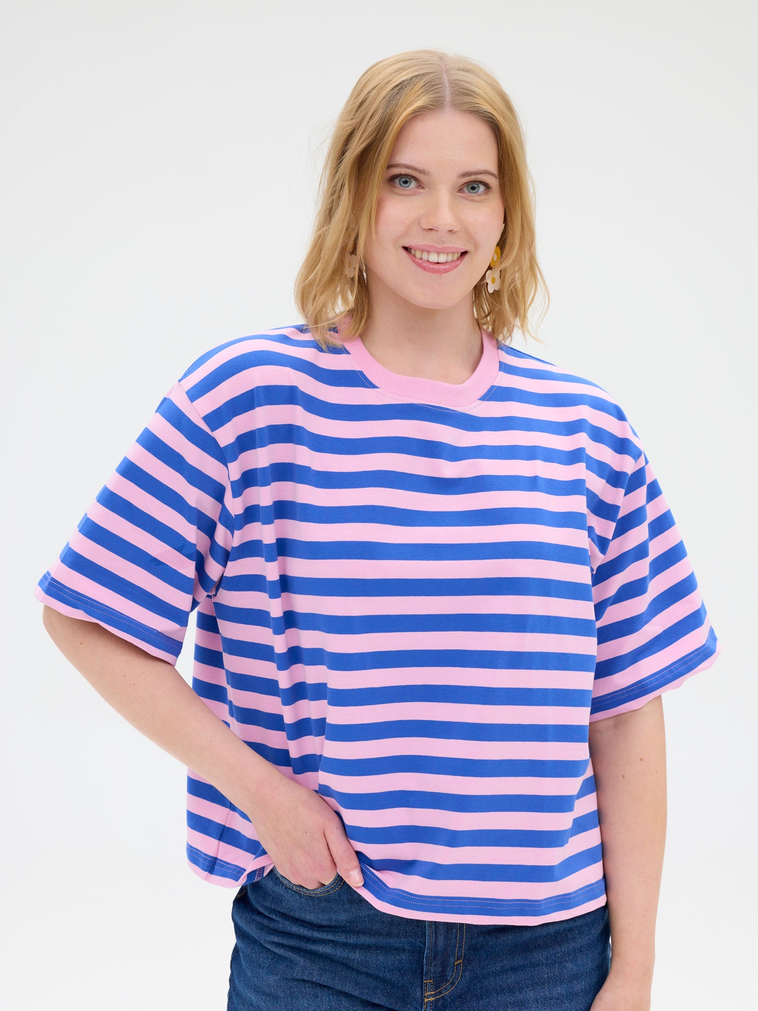 Klassinen raita paita pirteässä pinkki-sini raidassa. Laatikkomainen, lyhyempi malli antaa t-paidalle persoonallisen ilmeen. Raidan leveys on 20 mm. Pääntiellä pinkki ribbi. Materiaali on pehmeää trikoota, joten paita on mukava päällä. Paidassa on lyhyet hihat ja pyöreä pääntie. Valmistettu Portugalissa.