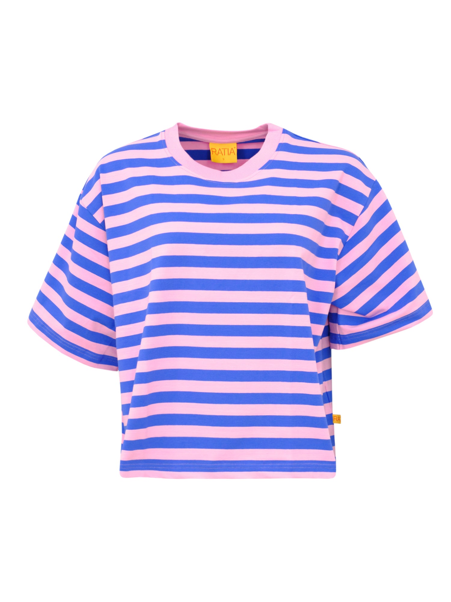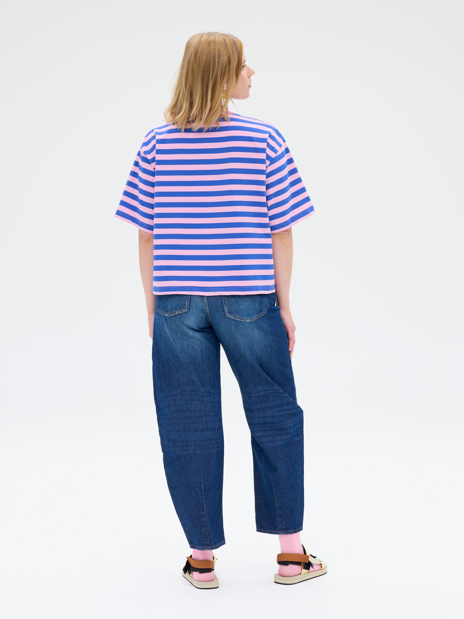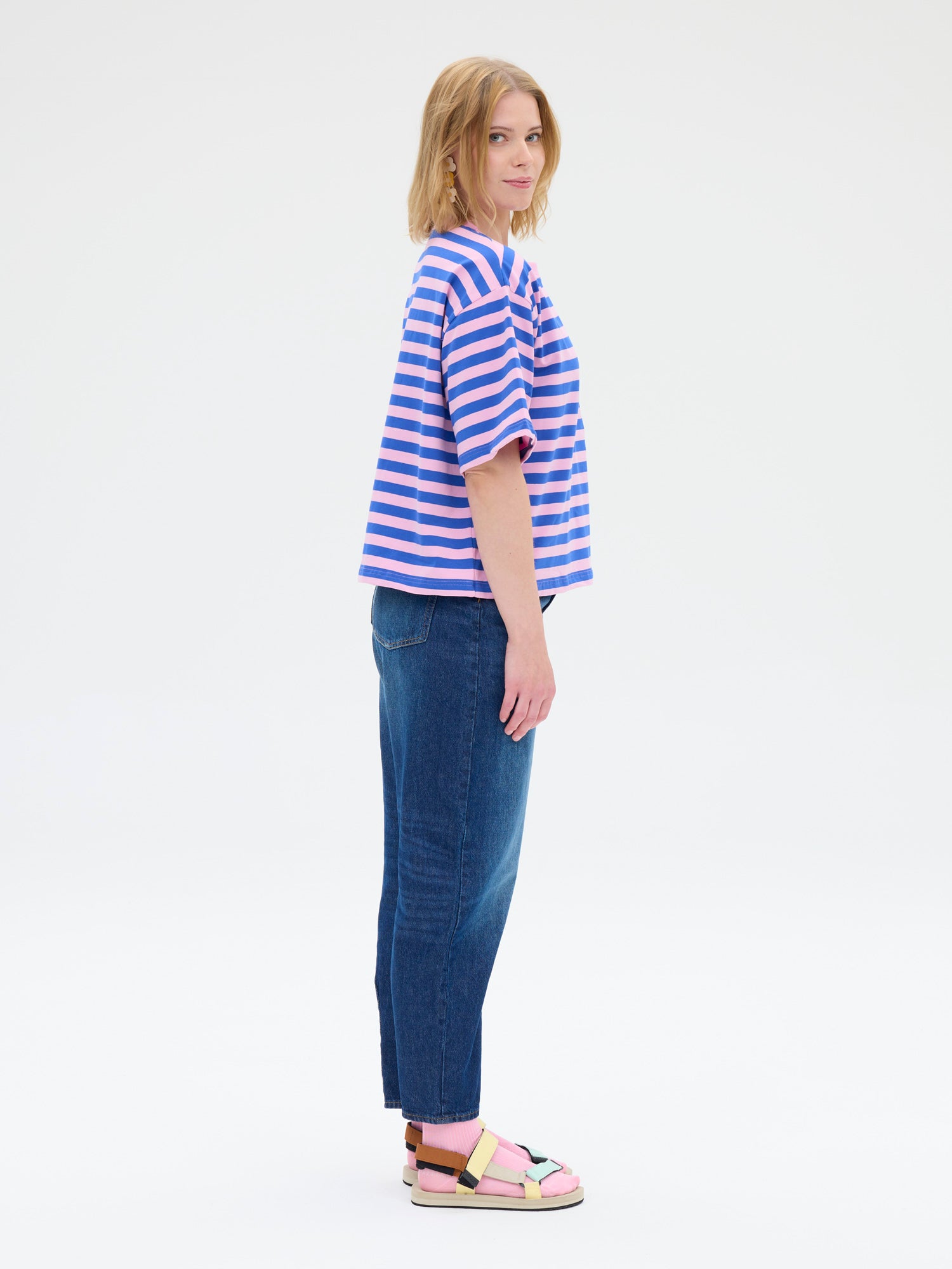 Klassinen raita paita pirteässä pinkki-sini raidassa. Laatikkomainen, lyhyempi malli antaa t-paidalle persoonallisen ilmeen. Raidan leveys on 20 mm. Pääntiellä pinkki ribbi. Materiaali on pehmeää trikoota, joten paita on mukava päällä. Paidassa on lyhyet hihat ja pyöreä pääntie. Valmistettu Portugalissa.
