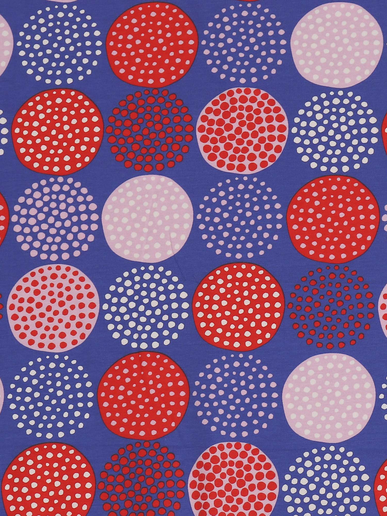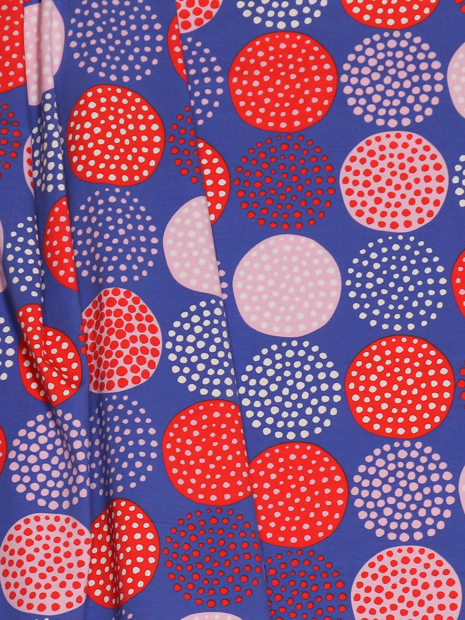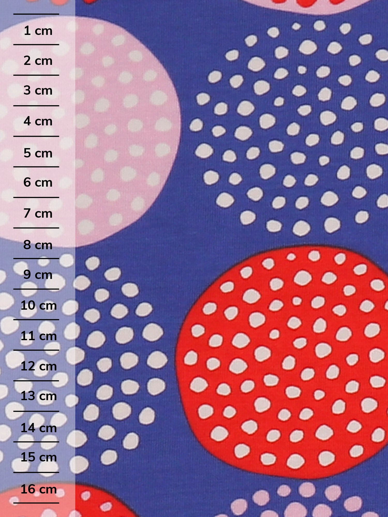 Laadukas puuvillatrikoo suositussa Lumipallo-kuosissa. Valmiin neulosrullan pituus on 2 metriä. Neuloksen pohjaväri on sininen, ja pallot ovat punaisen eri sävyissä. Tästä neuloksesta saa ommeltua esimerkiksi tunikan, paidan tai mekon.