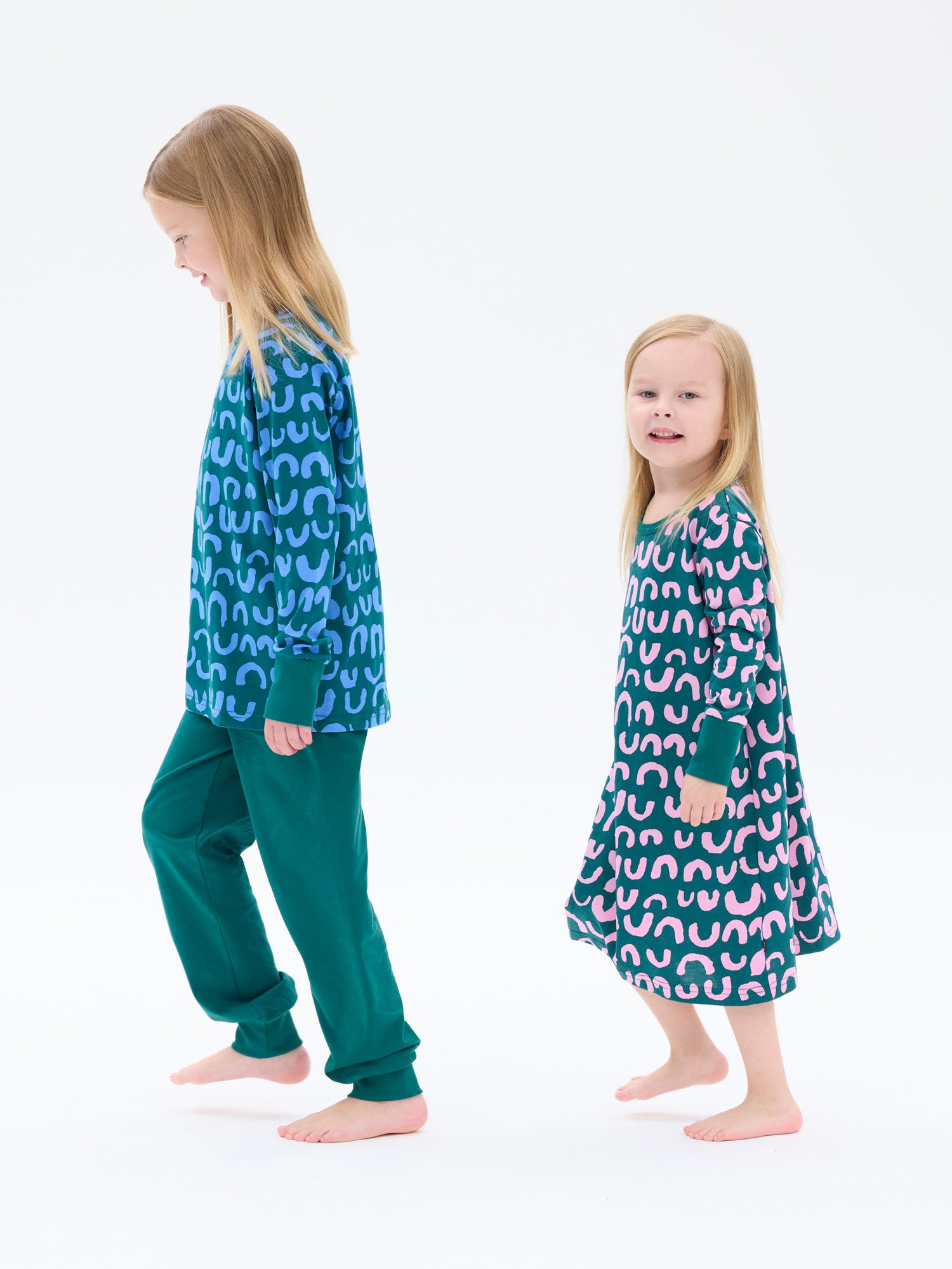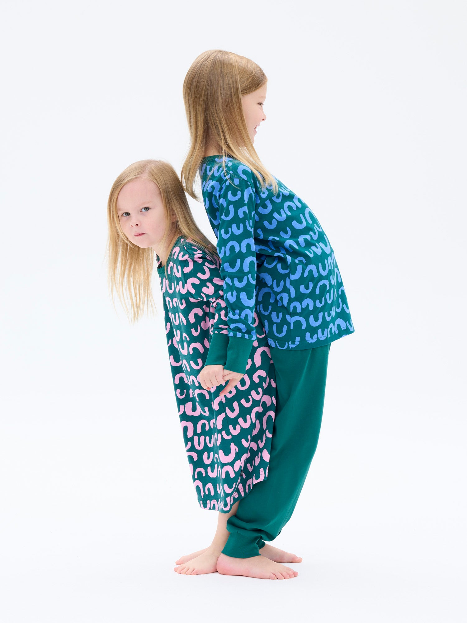 Lasten trikoopyjama on täydellinen asu kotoiluun ja yöksi lämmittämään. Paidassa on pirteä Nurinkurin-kuosi ja yksiväriset, vihreät housut. Housuissa pitkät suorat lahkeet, kuminauha vyötäröllä tuo käyttömukavuutta. Paidassa pitkät hihat ja pyöreä pääntie. Lahkeensuussa ja hihoissa on resorit jotka voi kääntää käyttäjälle sopivaksi ja antavat näin pyjamalle lisää käyttöikää. Materiaali on laadukasta 100 % puuvilla trikoota, joka on iholla pehmeää ja hengittävää. Pyjama on valmistettu Portugalissa.