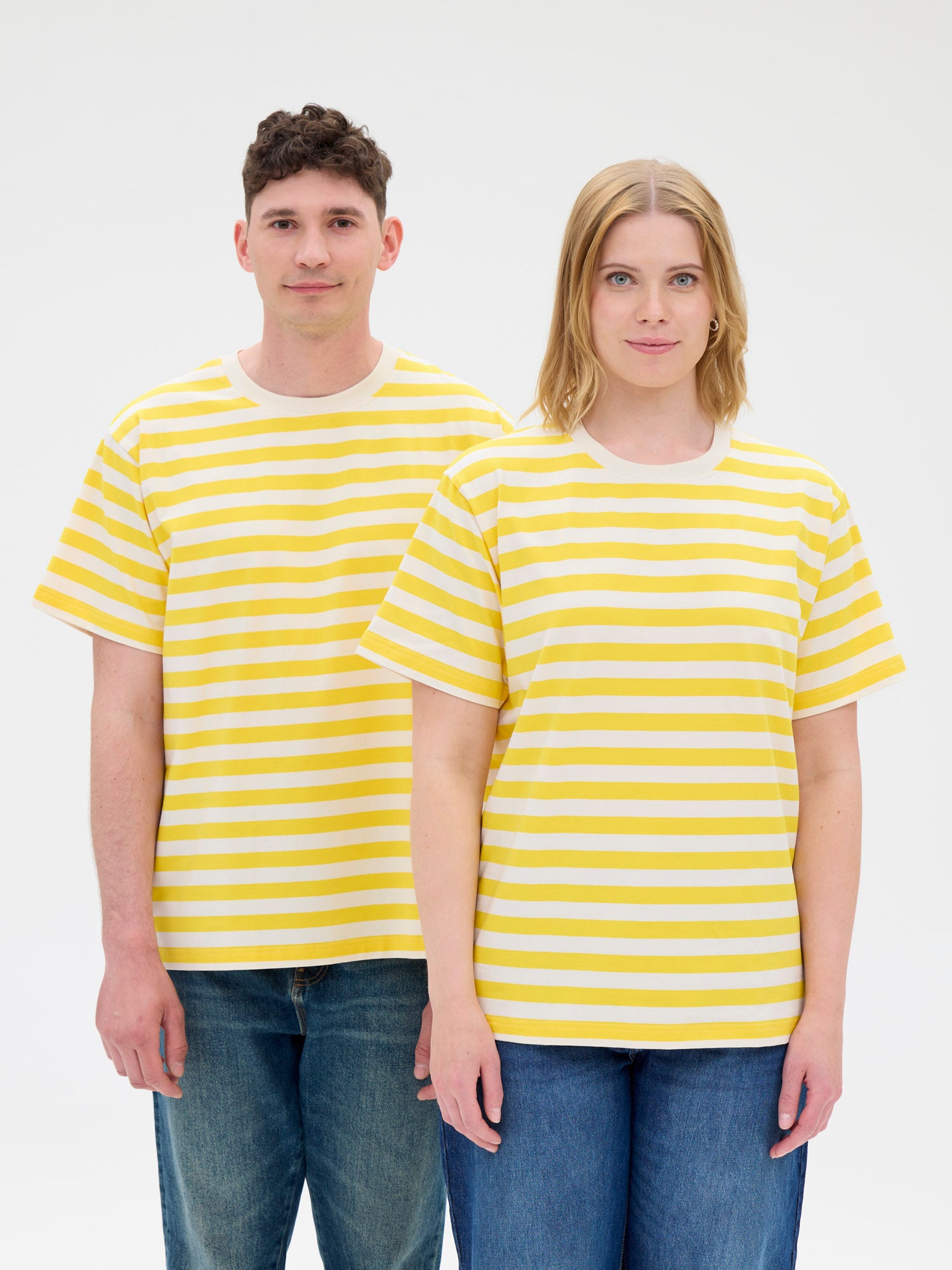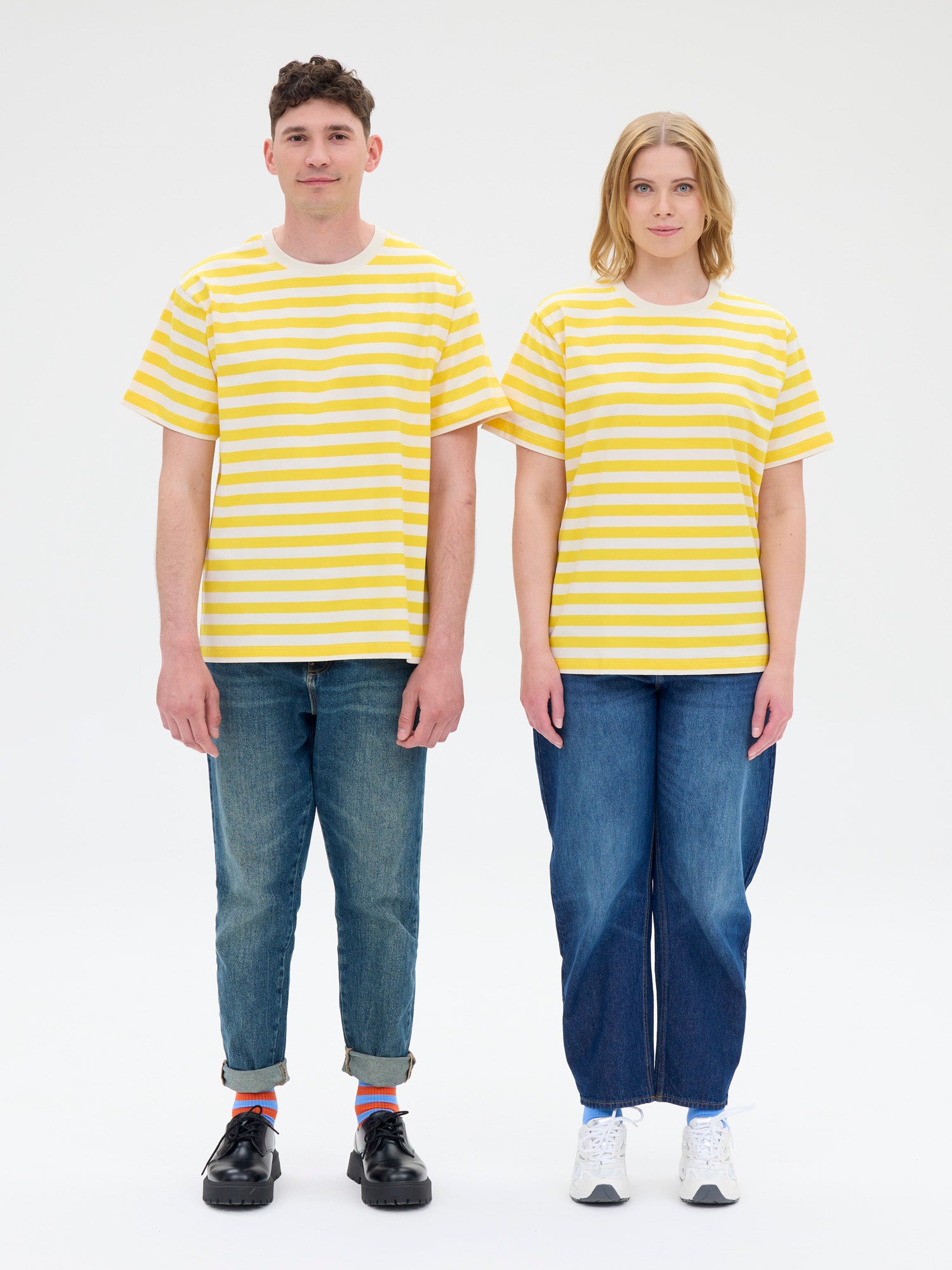 Klassinen raidallinen unisex paita kelta-valkoisella raidalla. Raidan leveys on 20 mm. Materiaali on pehmeää trikoota, joten paita on mukava päällä. Pääntiellä valkoinen ribbi. Paidassa on lyhyet hihat ja pyöreä pääntie. Jos haluat ostaa paidan naiselle, valitse yksi koko pienempi kuin normaalisti. Valmistettu Portugalissa.