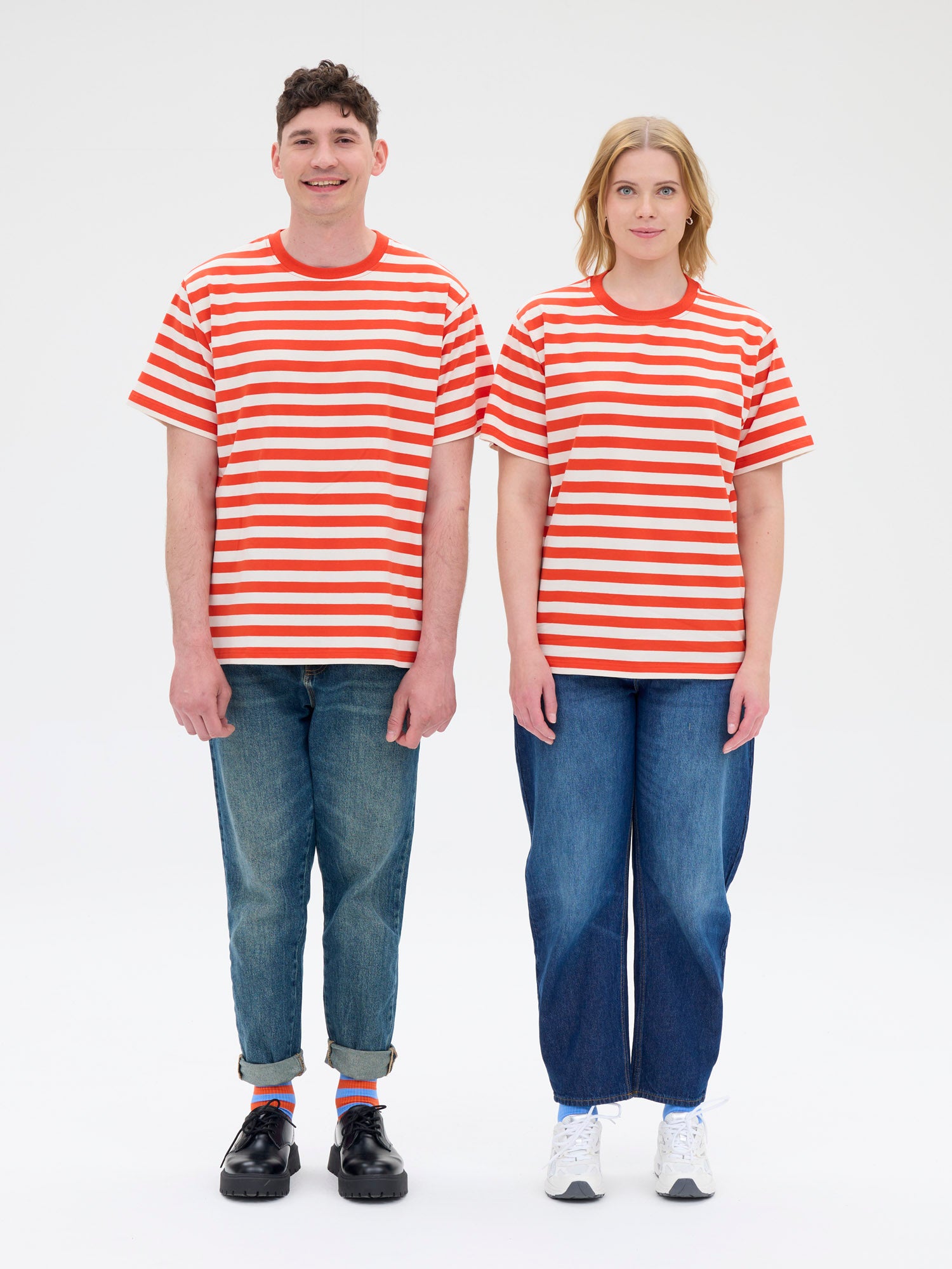 Klassinen puna-valko raidallinen unisex paita. Raidan leveys on 20 mm. Materiaali on pehmeää trikoota, joten paita on mukava päällä. Pääntiellä punainen ribbi. Paidassa on lyhyet hihat ja pyöreä pääntie. Jos haluat ostaa paidan naiselle, valitse yksi koko pienempi kuin normaalisti. Valmistettu Portugalissa.